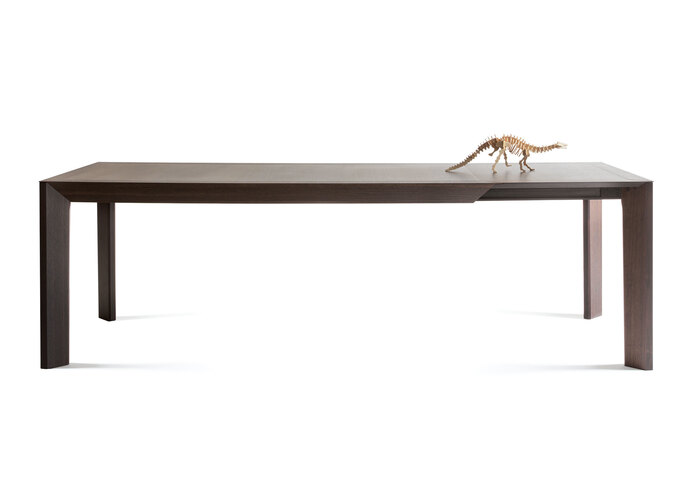 Thermally treated oak, consistent and with striking veins, stands out on the extension table Thera by Marelli e Molteni. The top, starting from 2 m wide, and 2,70 m long, maximum, is supported by legs oblique to the top as to create a perfect geometric matching. The triangular-section structure and legs enhance lines and thin and light thicknesses. The lower part of the top exhibits recessed parts making it far more linear while creating the unit where the technical devices are hidden.