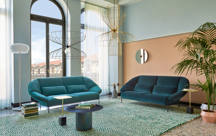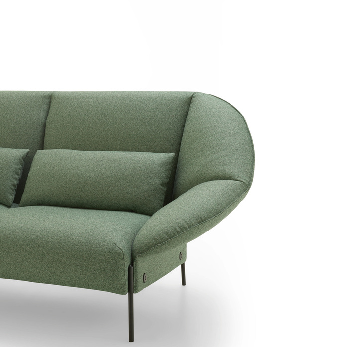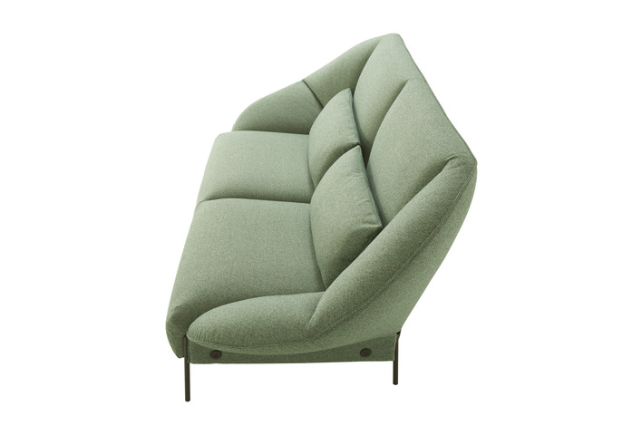 Das Projekt ist aus einer einfachen Handbewegung entstanden, dem Falten eines Blattes Papier, um eine geschlossene Form zu erzeugen. „Wie beim Origami haben wir, ausgehend von einer ebenen Fläche, einfache Faltlinien gezeichnet; zuerst die zum Trennen von Rückenlehne und Sitzfläche, dann die ausgeprägteren für die Seitenlehnen. Die beiden Enden der Rückenlehne sind zum Korpus des Sofas hin gefaltet und dort befestigt. So entsteht ein kokonartiges Sitzmöbel, dem man ansieht, wie bequem es ist.“