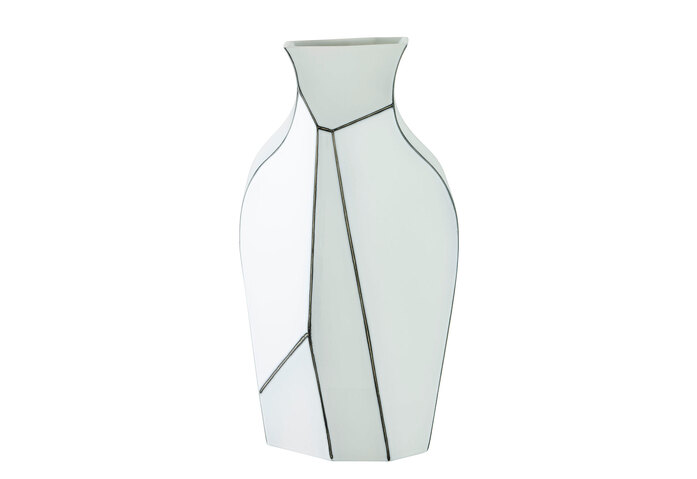 Große Vase aus weiß emaillierter Keramik mit schwarz bemalten Kanten.