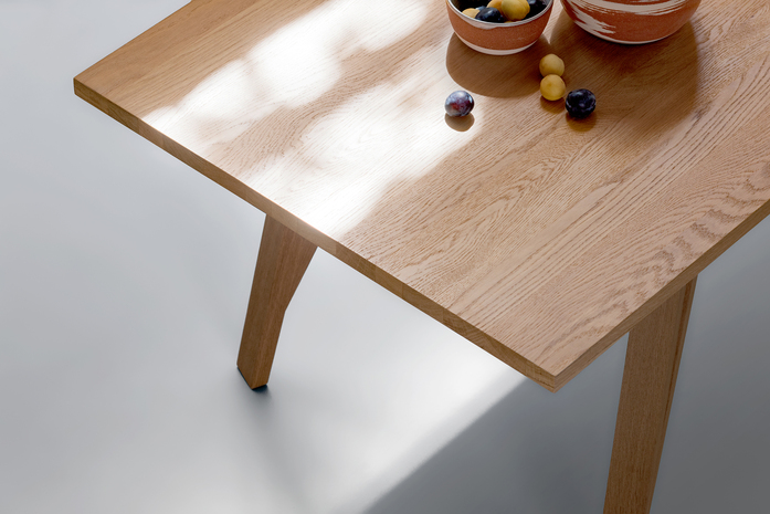 Die Sabeth Tische sind eine Weiterentwicklung der Faber Möbelfamilie. Sie übertragen die von Fachwerkarchitektur inspirierte Konstruktion auf einen vierbeinigen Esstisch in rechteckiger oder runder Ausführung und werden ebenfalls vollständig aus massiver Eiche gefertigt. Sabeth Tische lassen sich hervorragend mit dem JL1 Faber Hocker kombinieren. Sabeth Tische sind in drei Teile zerlegbar.