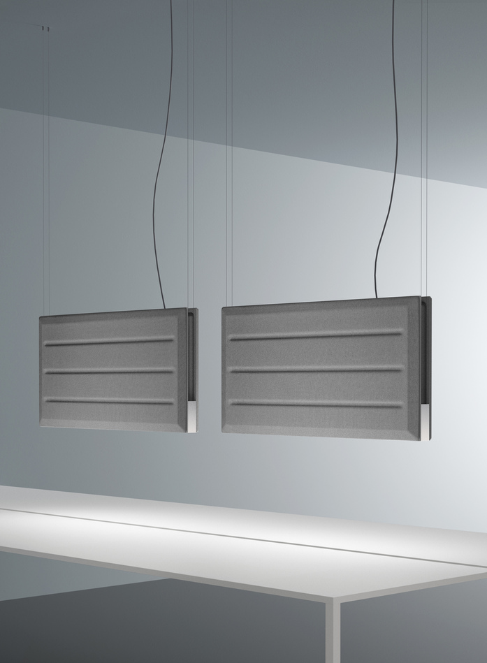 Eine lineare LED-Leuchte für Arbeitsräume: Dieses architektonische Modulelement definiert den Raum und personalisiert das Ambiente. Die beiden "Flügel"-Paneele können vertikal oder horizontal positioniert werden, um eine Komposition oder eine große Deckenleuchte zu gestalten. Die beiden vorgeschlagenen Lösungen verschmelzen zu Lichteinheit, Schallabsorption und "Ceiling" im Raum und heben die Notwendigkeit einer Zwischendecke auf.