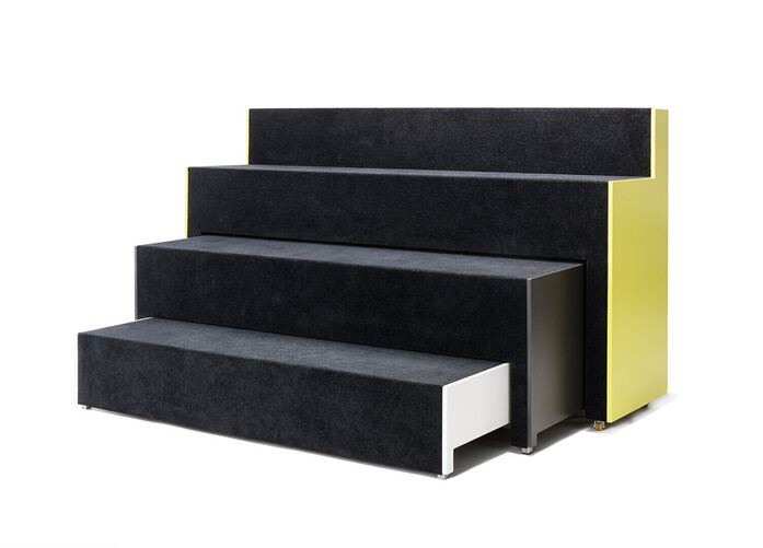 Beatbox is an auditorium-like piece of furniture for working and learning environments. It is a cozy and relaxed place for informal gatherings, presentations, as well as team work. Beatbox designed by Iiro Viljanen helps to improve also the utilization of lobby and corridor areas. The area in front of the stand forms a stage-like space and this feature is emphasized when two or more pieces are placed close to each other. With castors underneath, Beatbox is easy to relocate. The telescopic open-close function makes it easy to store temporarily when needed. Beatbox serves also as a space divider and when closed as a standing height workstation.