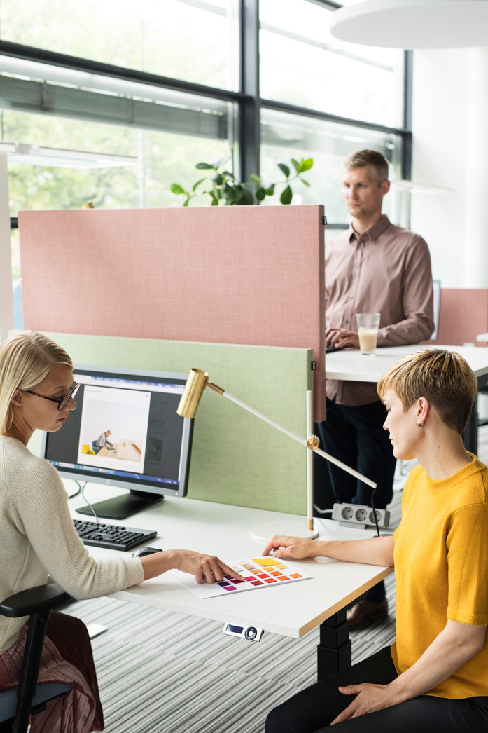 The acoustic features of the screens absorb sound, providing a pleasant and peaceful place to work. The materials used in the Face range are recycled, hypoallergenic polyester fibre. With the Face screen series, spaces can be used efficiently and for many needs. The screen series includes floor and table screens in several widths and heights to easily form combinations that suit all kinds of space. Face screens can lend visual consistency, even when different kinds of workstations are being used in the same space.