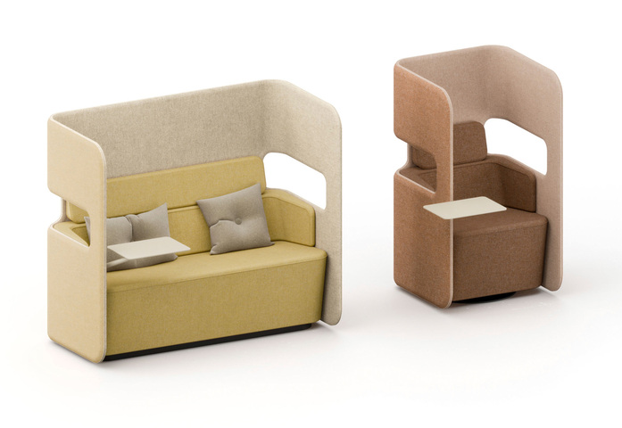 PodSofa offers a comfortable and private space for two persons in various spaces of a modern activity based office. The sofa can be used individually or in groups to create small, more private spaces for meetings. Thanks to its compact size, the sofa can be used even in small spaces and is easy to move to a new place. Various upholstery materials can be used to add character to the space. The window openings in the PodSofa also function as armrests. A movable desktop is an optional accessory. They can be added to both sides of the PodSofa. The sofa is also available with low backrest and a desktop for laptops is available as an accessory. The Pod product family designed by the o4i Design Studio also includes several other products with coherent design.