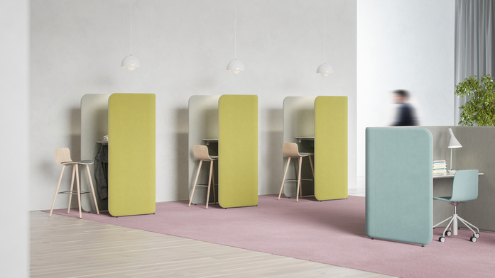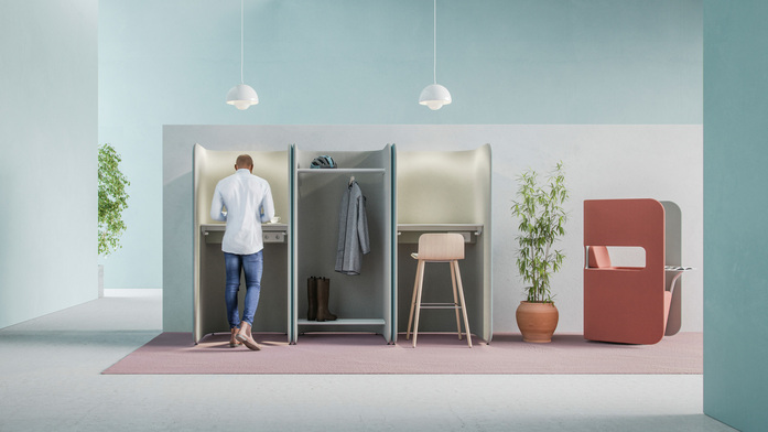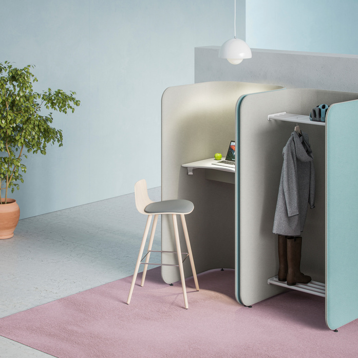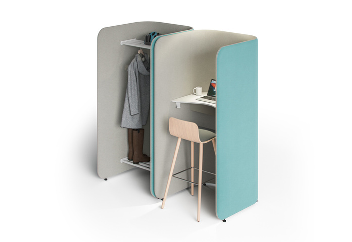 PodWork Xpress offers a private place for short-term working in an activity based office. The table top is available either in seat or standing height. The collection includes also a wardrobe unit. Together with other Pod products the PodWork creates a harmonious solution for the entire office. Various upholstery materials can be used to add character to the space. The Pod product family designed by the o4i Design Studio also includes several other products with coherent design.