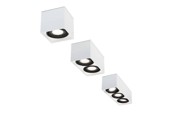 Aufbaustrahler für den Einsatz von dimmbaren & verspiegelten Spot-Leuchtmitteln, mit scharfkantigem Aufbaugehäuse, ohne sichtbare Verschraubung, Leuchtmittel 360° dreh- und 25° schwenkbar.