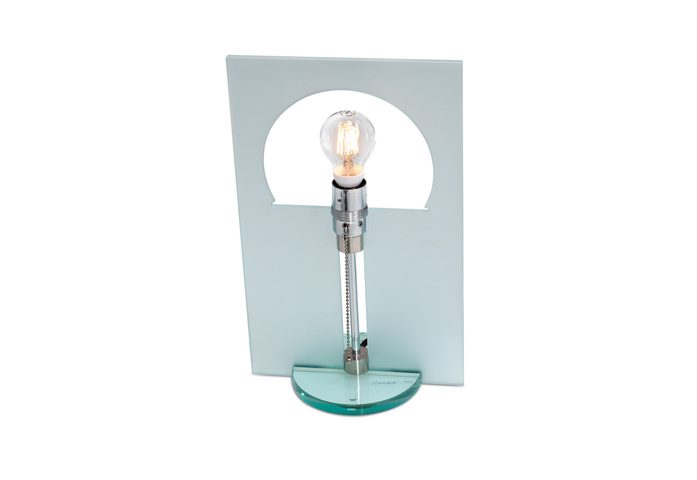 Eine metallene Fassung auf einem Glasfuß sind das Herzstück der Leuchte. Das Prägnante aber ist die satinierte Glasplatte, in die der Schattenriss der Bauhaus-Leuchte geschnitten ist. Der Zugschalter in Form einer Metallperlenkette und das schwarze Baumwollkabel mit Schnurdimmer sind weitere wichtige Merkmale, die das Design dieser Leuchte bestimmen.