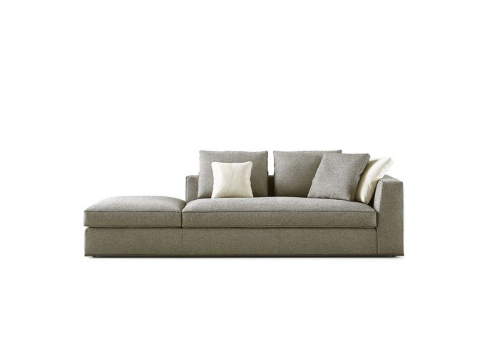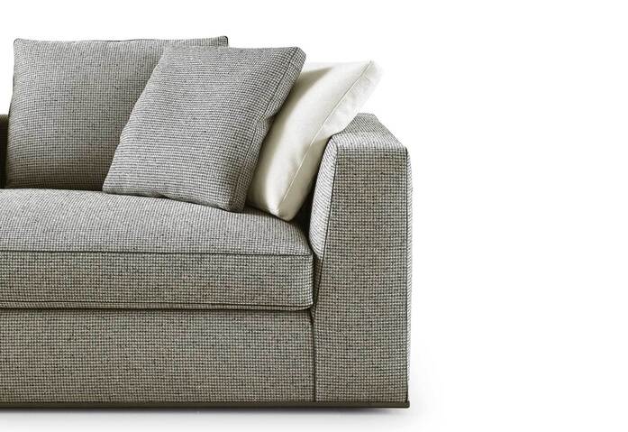 Otium is a new seating system that stands out for its contemporary classic style, generous proportions and great comfort. Available in various sizes and two seat depths, this modular line offers multiple linear and angular compositions, also with terminal elements with ottomans. Highly distinctive details are the tapered armrests and the faux leather trimmings that outline and embellish the armrests and the seat and backrest cushions. The base is defined by a metal profile in black chrome or bronzed nickel painted.