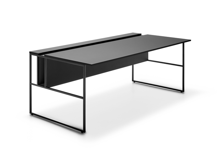 Mit einem neu gestalteten Schreibtisch, dem Archetyp des Arbeitsplatzes, wird im Büro eine zeitgenössische Atmosphäre geschaffen. Der Kontrast zwischen vollen und leeren Volumen, die fein abgestimmte Kombination verschiedener Oberflächen und die Integration der Verkabelung in die tragende Struktur setzt neue Maßstäbe bei der Büroeinrichtung.