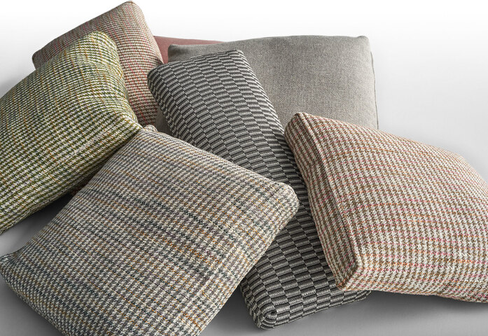 Polstermöbelsystem aus kombinierbaren Modulen mit Sitzelementen verschiedener Länge und Tiefe, Rückenlehnen in verschiedenen Höhen, Beistelltischen und Zusatzkissen. Dank seiner Vielseitigkeit bietet dieses System die Möglichkeit, es ganz nach eigenem Bedarf zusammenzustellen und unterschiedlichsten Umgebungen, Räumen, Stilen und Geschmacksrichtungen anzupassen.