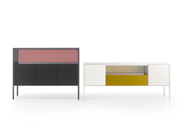 Der Rahmen der Schrankwände ist immer matt und in zwei Kombinationen lieferbar: - matt weiß lackiertes Metallprofil mit lackierten mikrogeprägten Paneelen in elfenbeinweiß; - matt hellgrau lackiertes Metallprofil mit lackierten mikrogeprägten Paneelen in Mittelgrau; Jedes Schrankelement kann individuell gestaltet werden durch die Farbwahl des “Möbelinneren” in verschiedenen matt lackierten Ausführungen: Elfenbeinweiß, Mittelgrau, Dunkelrot, Ockergelb, Dunkelorange und Petrolblau. Als Möbelinneres gilt je nach Typus: - Rückwand aus Lochblech (beidseitig) - Rückwand aus Leichtbauplatte nur Innenseite - Innere Einlegeböden, wo vorgesehen; - Schubladenfront.