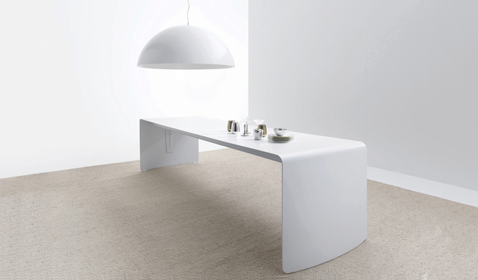 Tisch aus einer gebogenen naturbelassenen anodisierten Alufolie. Neue Version in Mattweißlack, auch für den Außenbereich geeignet. Höhe 73 cm. Max. Länge 4,40 m. Maße: 80x200, 220, 240 cm - 90x280, 320, 360, 400, 440 cm