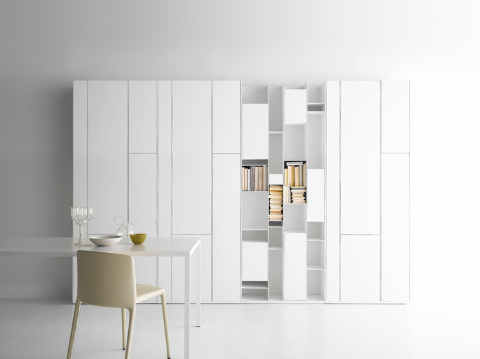 Fächerschrank aus MD-Holzfaserpaneelen mit Mattlackierung (mikro-gaufrierter) in weiß; 12 mm starke Seitenteile, Fachböden und Türen. Rückwand mit Melaminbeschichtung in weiß (Dicke 10 mm). Mit geschlossenen Fächern in Standardgrößen. Innere verstellbare Fachböden. Dank der großdimensionierten Fächer und der neuen Tiefe (35 cm) läßt sich der Raum funktional verwenden. Möglichkeit von groß dimensionierten Konfi gurationen durch Reihung mehrerer Elemente, auch von der Serie Random Box und Random. Einzelelement, immer umkehrbar. Bei der Reihung mehrerer Elemente wird durch das Drehen eines Einzelelements ein horizontal durchgehender oder ungleicher Rhythmus geschaffen. Zu diesem Zweck wird der Sockel lös geliefert, so daß er in die gewünschte Richtung benutzt werden kann. Verstellbare Füße bis zu 15mm.