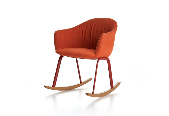 The small armcharis has a load-bearing shell made of Baydur® (compact technopolymerfor moulding) over-moulded with polyurethane foam rubbers; Seat in metaltubing covered in polyurethane foam rubber. Polyester wadding. Padded small armchairs can be covered in fabric or leather. The upholstery is completelyremovable.