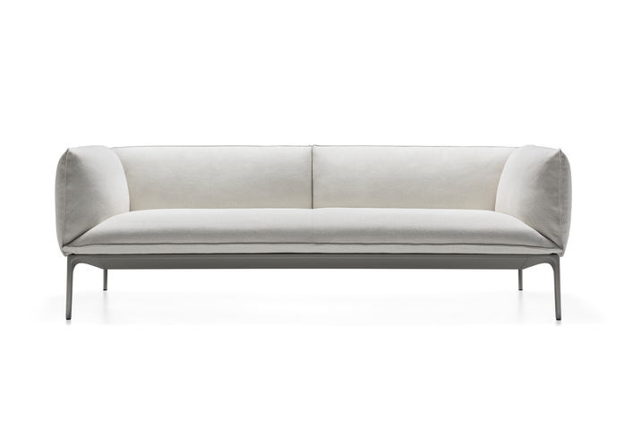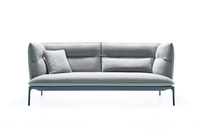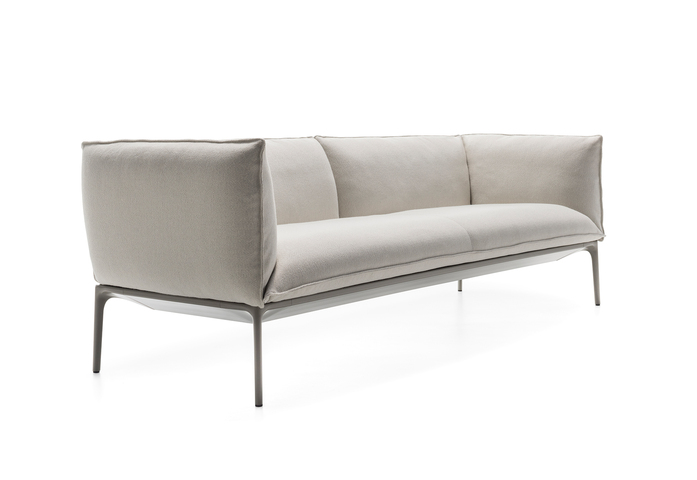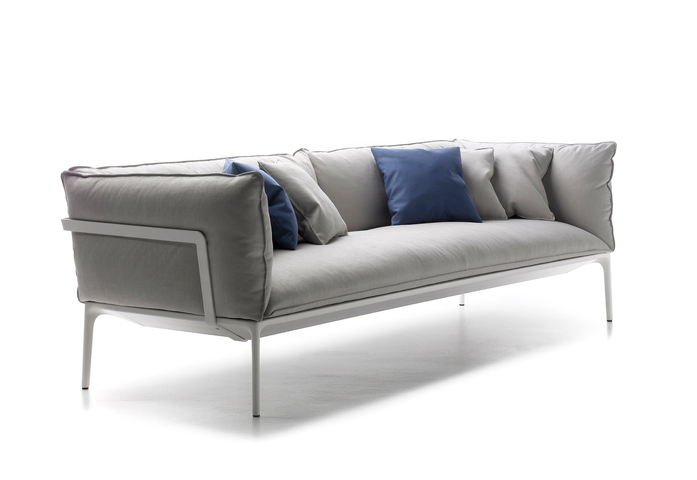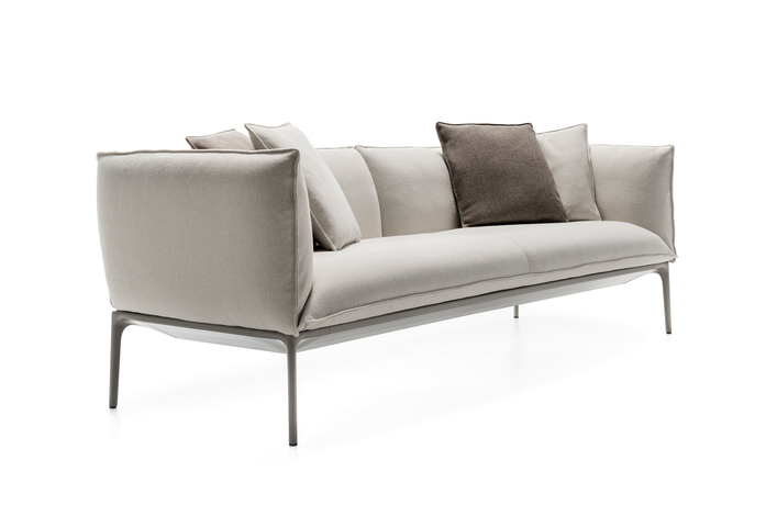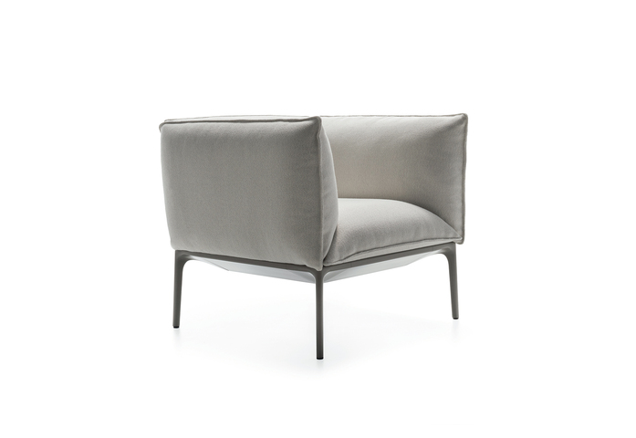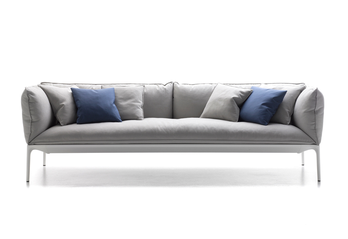 Kennzeichen dieser Sessel und Sofas ist die großmäßige Kissenlandschaft. Aufl age aus extrudiertem Aluminium, Füße aus stranggepresstem Aluminium, matt lackiert in weiß oder schwarz, oder in glänzend weiß. Version mit tiefer Sitzfl äche. Neue Ausführung aus Daunen. Die Kollektion verfügt über drei Hockermodelle.