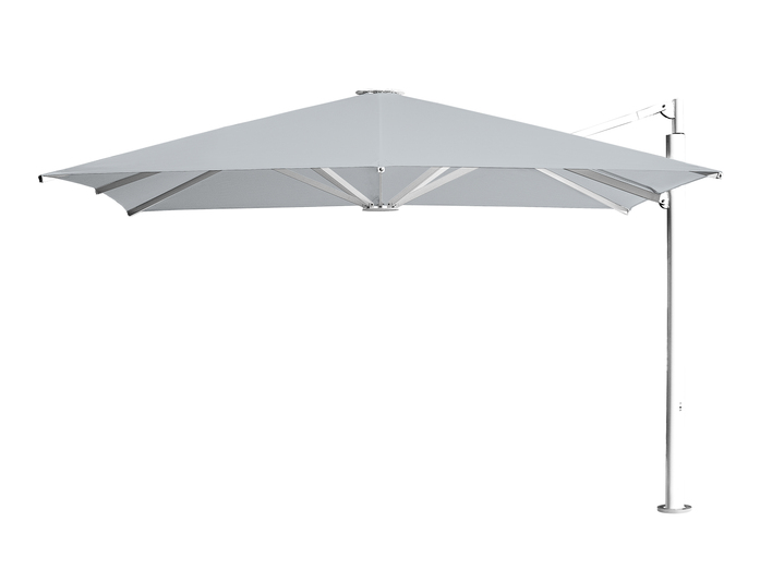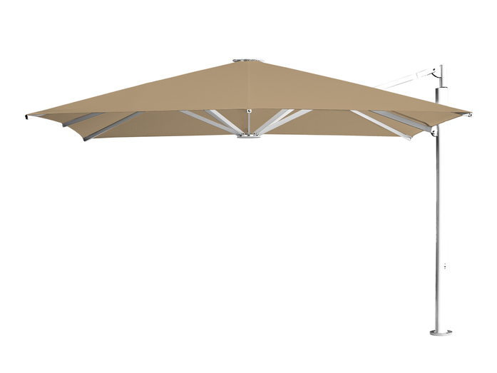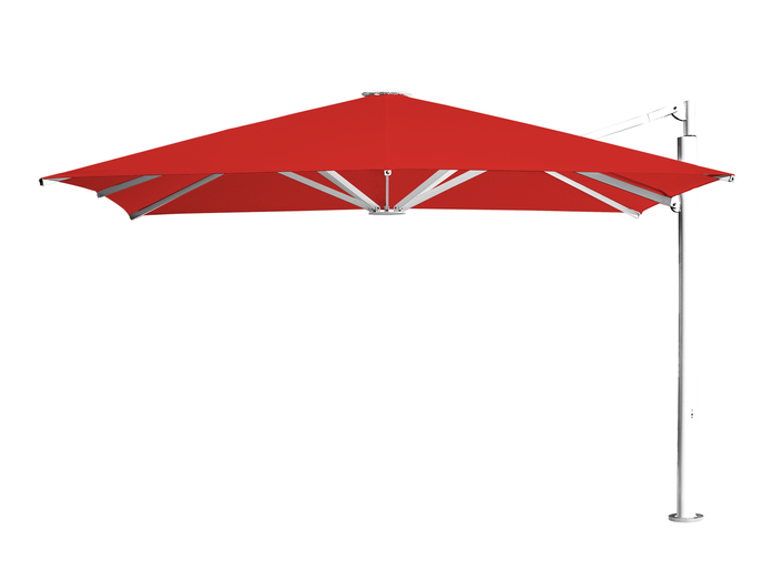 Der Seitenarmschirm wird idealerweise bei Freiflächen mit Durchgängen oder bei optimierter Sitzplatzgestaltung eingesetzt. Der drehbare Schirmmast besitzt ein ovales Profil für maximale Stabilität und zur Verkabelung des Schirms.