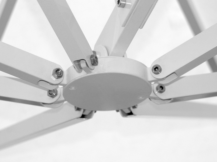 Der Spannmechanismus des Schirmes wird mithilfe einer Kurbel bedient, welche ein innenliegendes Teleskopsystem steuert.