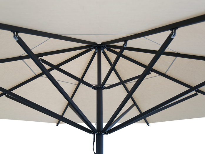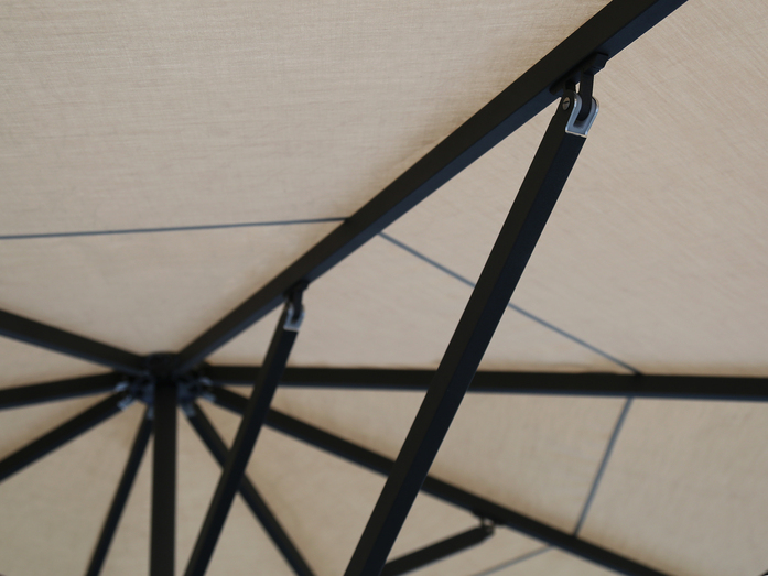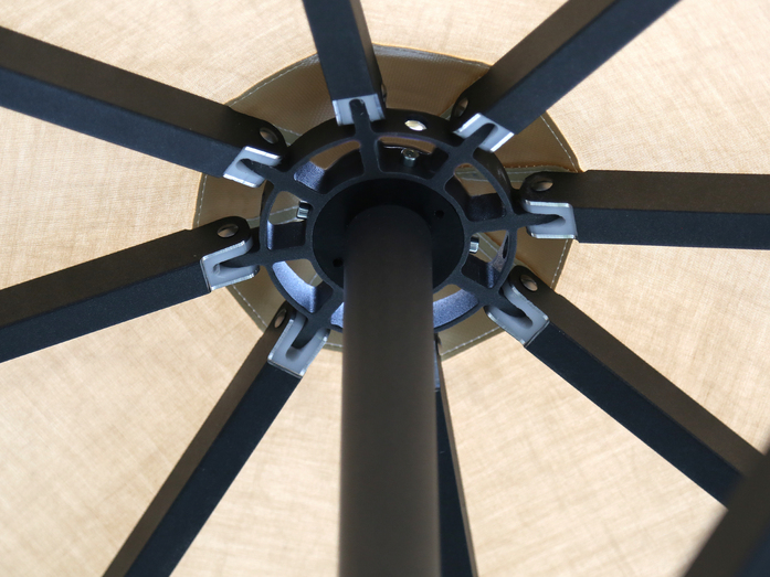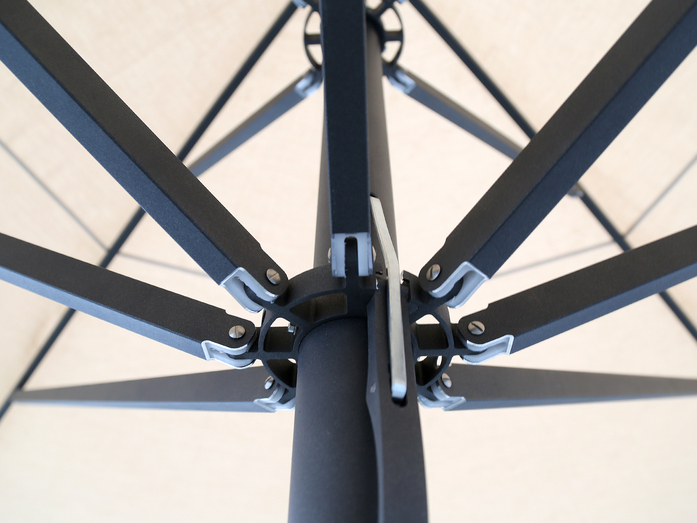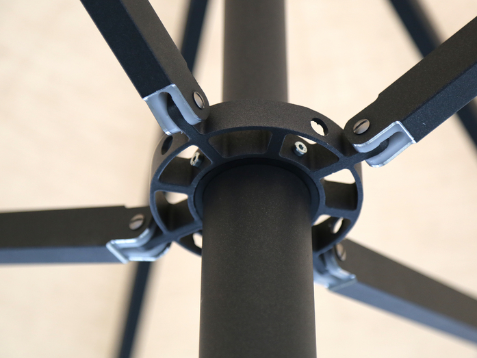 Streben bestehen aus Aluminium-Rechteckprofilen 30 x 20 x2 mm. Der Mast besteht aus einem Aluminium-Rundrohrprofil ø 60 x 3 mm mit einem 3-fache Vollaluminiumkranz, Aluminium Teleskop mit den Abmessungen 30 x 30 x 3 mm. Der Kranz ist aus hochfestem Aluminium gefertigt und enthält Verbindungen für die Strebenaufname. Alle Teile sind miteinander verschraubt. Das Gestell, die Strebenendkappen, der Kranz, die Abdeckung und der Griff (anthrazit) ist pulverbeschichtet (Polyesterpulver ca. 80 µ).