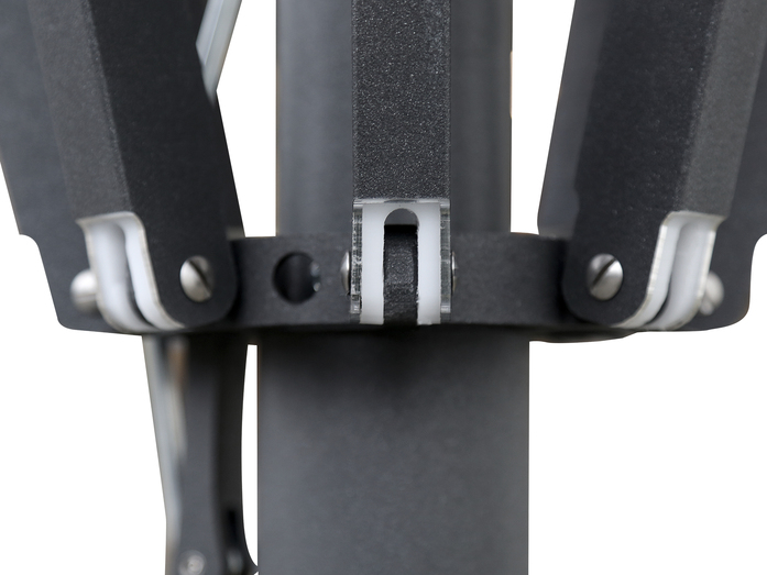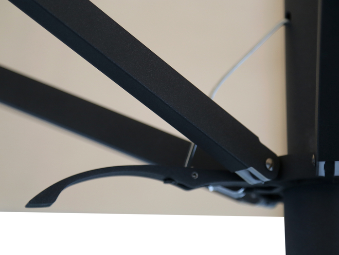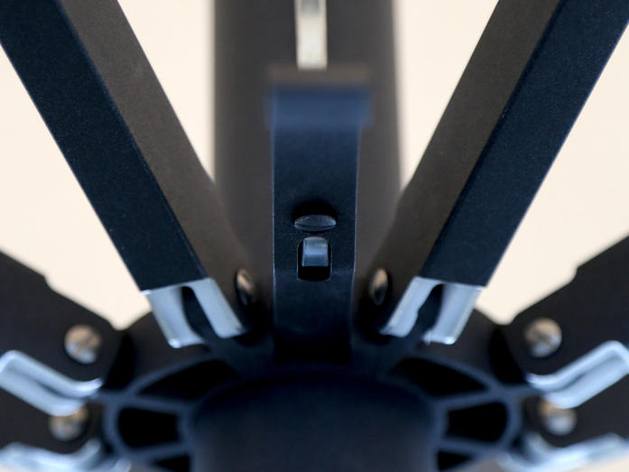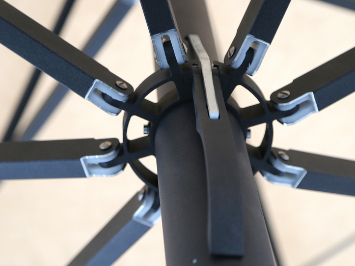 Der Spannmechanismus des Schirms wird mit Hilfe eines Aluminiumgriffs bedient. Dieser kontrolliert das interne Teleskopsystem, durch einen zink-beschichteten Zugriemen. Diese optimale ausbalancierte Spannmechanik gewährleistet eine einfache Schließung des Schirmes.