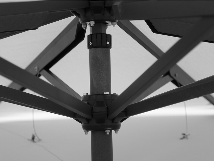 Spannmechanismus mittels zweiteiligem am Schirm geführten Aluminiumspanngriff und im Mast innen liegende Zugstange.