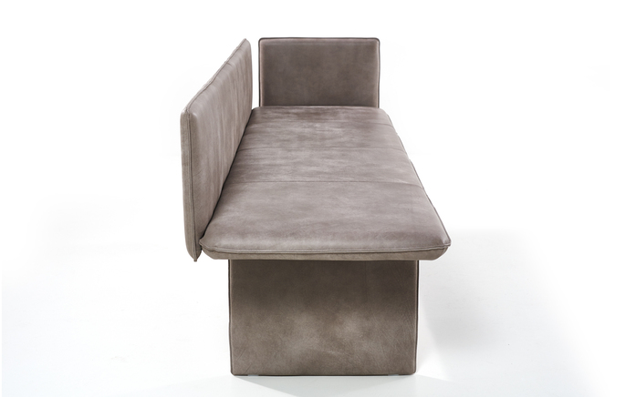 Bank mit Gurtpolsterung, Bezug aus Leder oder Stoff. Optional mit Rückenlehne (30 cm oder 50 cm) und/oder Armlehnen. Zwischenmaße möglich. Wahlweise mit Wangen, mit verchromten oder anthrazitfarben lackierten Kufen. Auch wandhängend oder als Eckbank erhältlich.