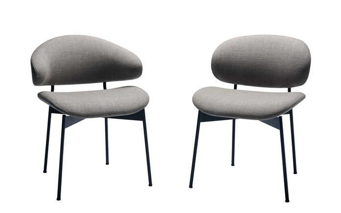 Stuhl mit oder ohne Armlehne mit ökologischer Polsterung (Formholz, Kaltschaum aus Rizinusöl, Schafschurwolle). Mit Stoff- oder Lederbezug, nicht abnehmbar. Sitzhöhe: 47,5 cm. Gestell: Stahl, schwarz lackiert.