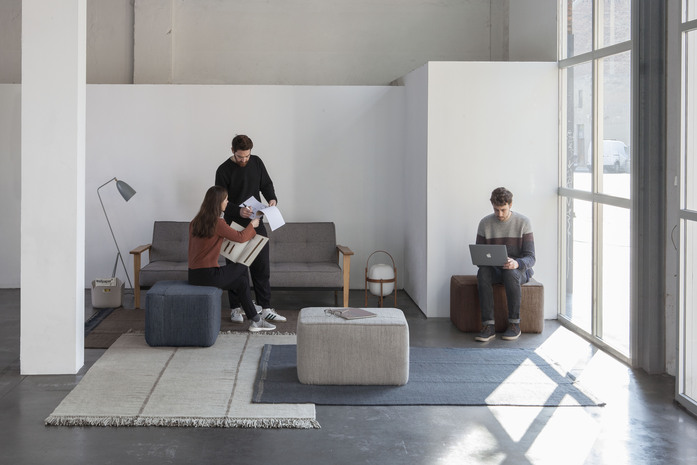 The rug collection is accompanied by four cubic poufs, completely upholstered, designed by Andreu Carulla. The embroidered braid references the creation process of the rugs. The combination of the poufs and rugs creates informal environments for both home and office.