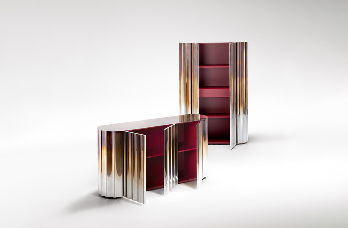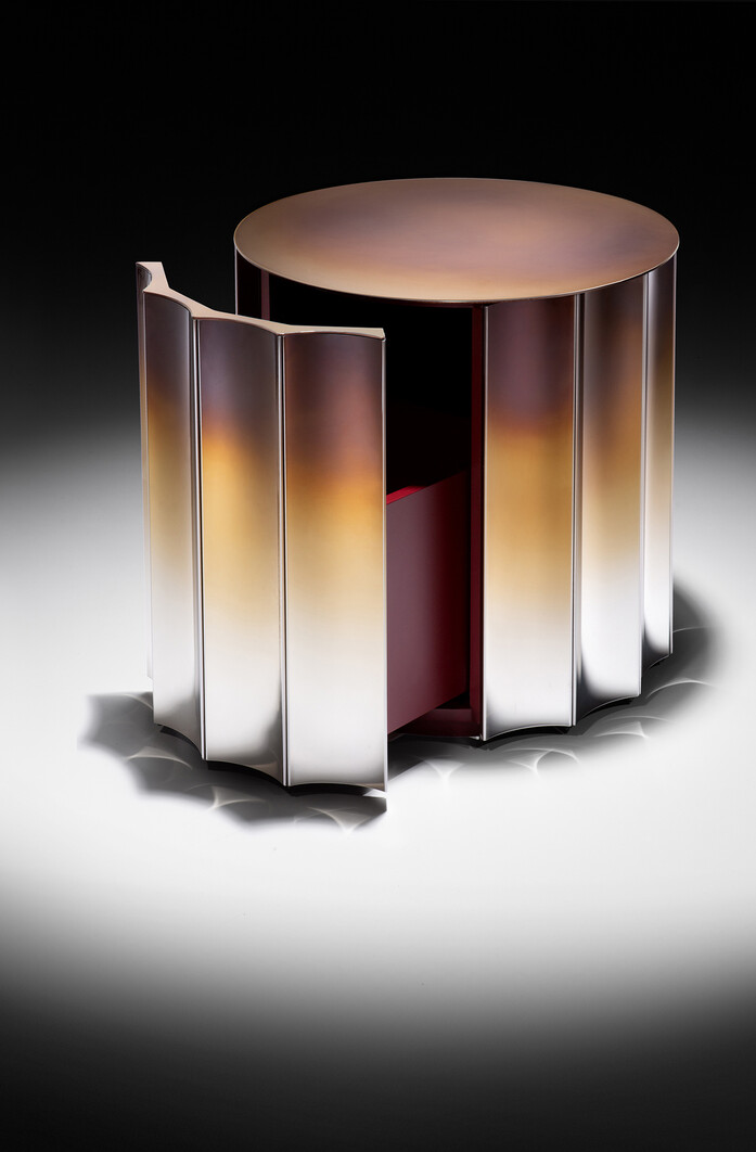 Die neue DeFauvé-Edelstahloberfläche verstärkt dieses visuelle Spiel: Ein überraschender Farbverlauf beginnt an der polierten Basis und steigert sich in Intensität bis zu einem tiefen Rotton an der Oberkante, erzeugt durch Oxidation. Das Licht lässt die Oberfläche vibrieren, betont die Dreidimensionalität der Lamellen und schafft irisierende Reflexe, die jedes Möbelstück zu einer skulpturalen Präsenz machen.