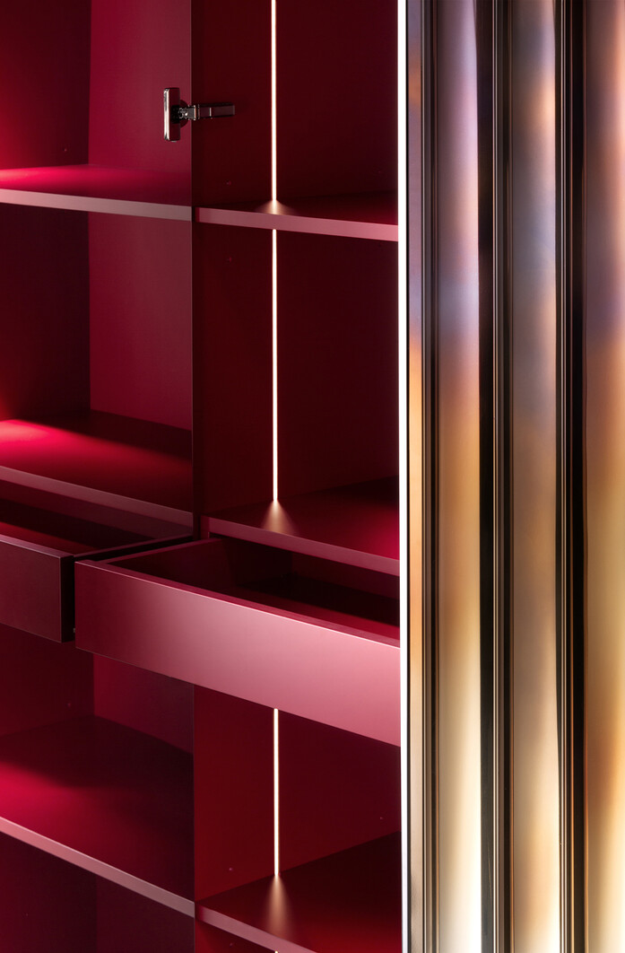 Im Inneren überrascht Dorica mit glänzendem burgunderfarbenem Lack – ein raffiniertes Detail, das das haptische und visuelle Erlebnis der Kollektion abrundet.