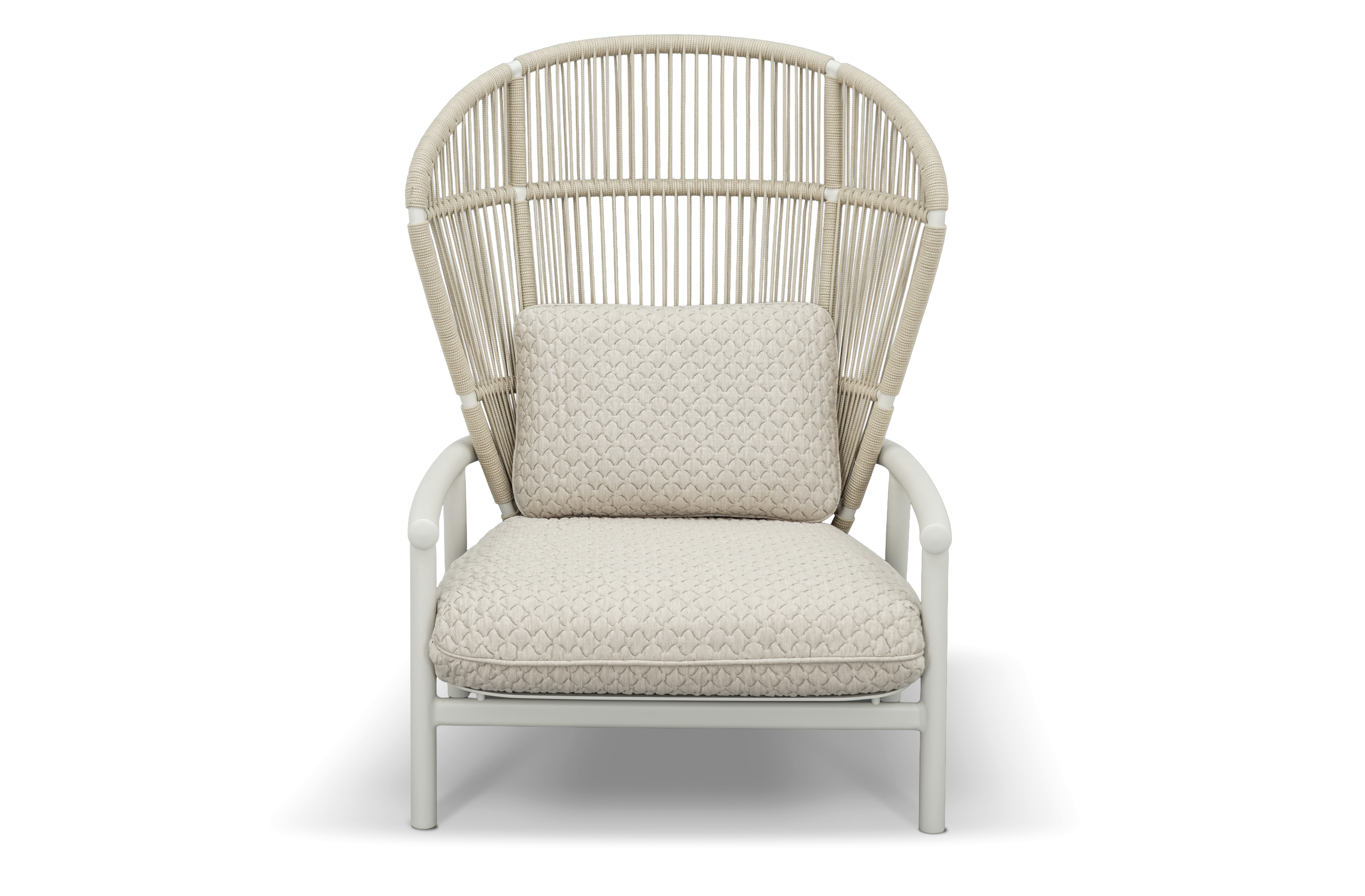 Fern von Sebastian Herkner ist eine imposante und zugleich gemütliche Kollektion mit einer Designsprache, die sich an der Natur orientiert. Die Verbindung aus praktischen Aluminiumrahmen und einem weich anmutenden Outdoor-Seil schafft eine umhüllende, geflochtene Rückenlehne, die sowohl Schutz bietet als auch Komfort vermittelt.