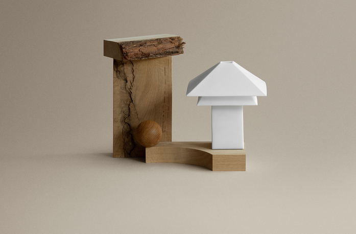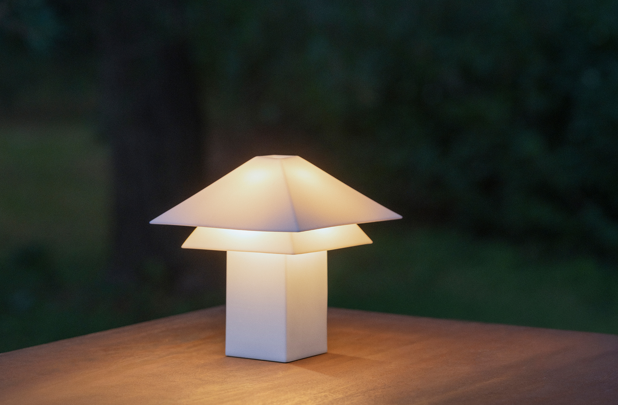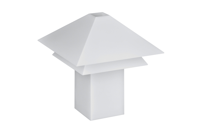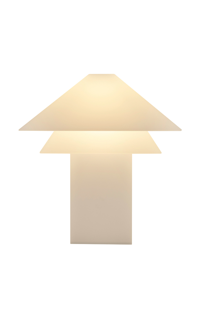 Gefertigt aus recyceltem Polycarbonat, vereint Sanaka Nachhaltigkeit mit hoher Robustheit. Die matte weiße Oberfläche und das transluzente Material erzeugen ein weiches, diffuses Licht, das an gefaltetes Papier erinnert. Ihr zweigeschossiges Dach verleiht der Leuchte die Anmutung eines kleinen Hauses und schafft eine stimmungsvolle Atmosphäre auf Terrasse oder im Garten.