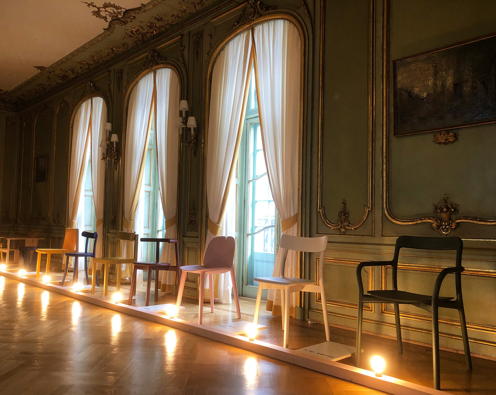 Mit einer Ausstellung in der italienischen Botschaft nahm das auf die Holzverarbeitung spezialisierte Familienunternehmen Mattiazzi in diesem Jahr das erste Mal an den 3daysofdesign teil und zeigte einen Auszug der Produkte der letzten zwei Jahre im Verbund mit Designklassikern. Da sich die Liste der DesignerInnen mit denen Mattiazzi seit Jahren zusammenarbeitet, wie ein Who is Who der Designszene liest, verwunderte es nicht, dass kein geringerer als Konstantin Grcic die Ausstellung entwarf. Dieser trennte so einen Bereich des Raumes an der Fensterfläche mit einem Kantholz ab, platzierte die Stuhlmodelle nebeneinander und setzte vor diese je eine LED-Glühbirne wie bei einem Hollywoodspiegel. Im Verbund mit den historischen Räumen der italienischen Botschaft wirkten diese so zugehörig und harmonierten mit der barocken Innenausstattung.