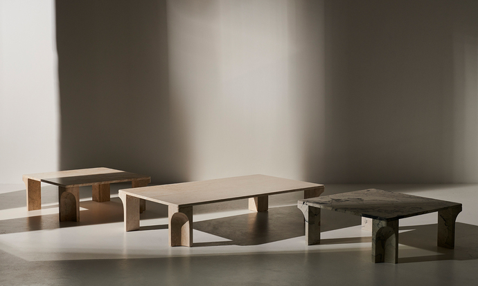 Ganze 2000 Quadratmeter Fläche bietet der Showroom von Gubi in einer ehemaligen Tabakfabrik in den Docklands von Kopenhagen und somit eine luftige Produktpräsentation wie auch ausreichend Raum für die Arbeitsplätze der MitarbeiterInnen. Gezeigt wurde neben einer Re-Edition der "Basket" Kollektion von Joe Colombo, die Rattanrohre für Sofas und einen Loungesessel in organische Formen bringt, auch eine Weiterentwicklung des "Beetle" Stuhls von GamFratesi mit 3-D Furnierschale sowie die Beistelltische "Doric" des Duos. Aus Travertin oder Kalkstein gefertigt, schaffen diese den Spagat zwischen massivem Material und eleganter Form – die quadratischen oder rechteckigen Platten ruhen auf Beinen, die mit einer bogenförmigen Aussparung wie geschnitzt anmuten.
