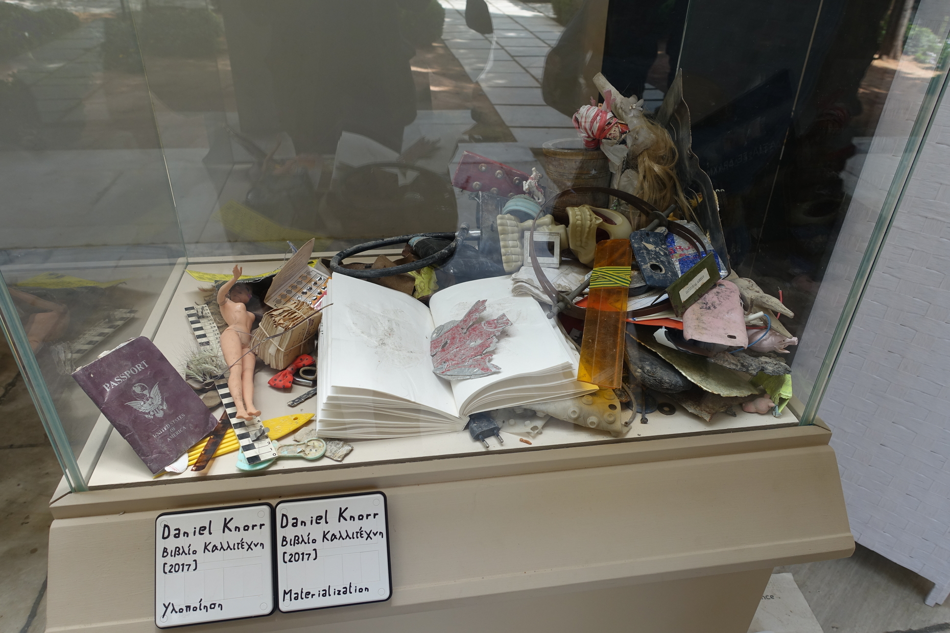 Beim Rundgang durch dieses antike Parlament der Körper, Haltungen, Mythen und Götter- und Menschengeschichten, hatte man die Documenta schon fast wieder vergessen. Wo war sie denn nun? Zurück am Ausgang fragen wir noch einmal nach und bekommen einen Tipp. Und siehe da: Auf dem Weg ins Untergeschoss steht, zwischen Schildern, die auf Sonderausstellungen, das Café, den Museumsshop und die Toiletten des Museums hinweisen, ein kleines, aus rohen Spanplatten gezimmertes Hinweisschild. Im Untergeschoss muss man trotzdem noch eine Weile suchen, bis man am Rand des Innenhofs unter der Treppe eine kleine Vitrine entdeckt. Darin unter anderem ein amerikanischer Pass, ein aufgeschlagenes Buch, der Körper einer Puppe – alles Müll. Angeblich verarbeitet ihn Daniel Knorr zu Kunst. Zu sehen ist davon nichts. Erst später, im Konservatorium, wird man auf die Recycling-Installation stoßen, in der aus gefundenen Objekten Künstlerbücher gemacht werden. Die antiken Statuen würdigen Knorrs kleines Rohstofflager sowenig eines Blickes wie die Touristen, die das Museum besuchen.