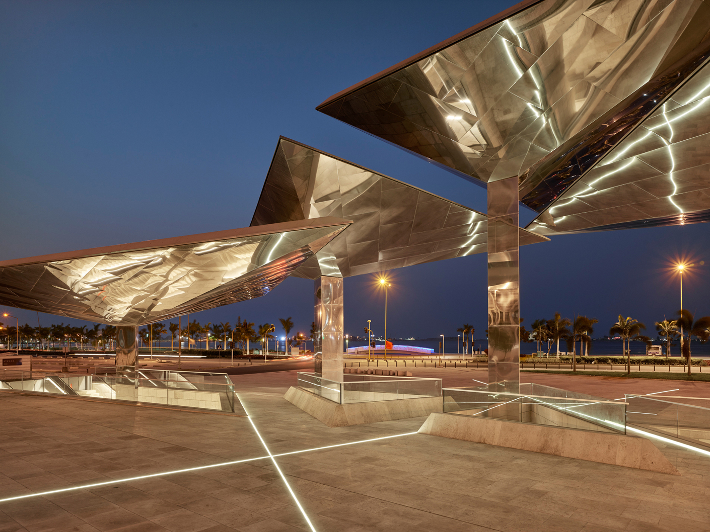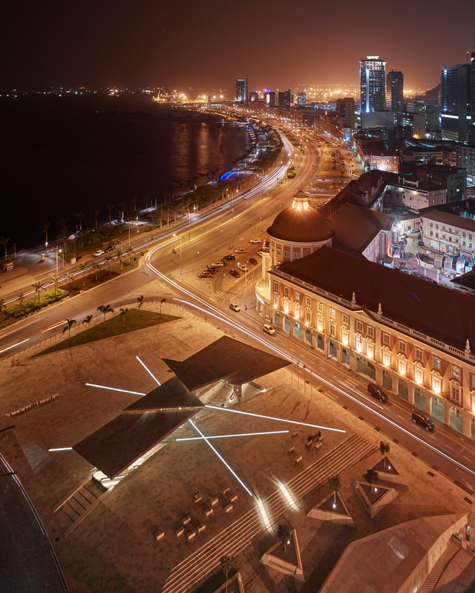Einen attraktiven wie repräsentativen öffentlichen Platz zu schaffen und gleichzeitig den Eingang zum unterirdisch gelegenen Museum of Moeda in der angolischen Hauptstadt Luanda markieren – das war die Aufgabe für das Architekturbüro Costa Lopes. Die Architekten entwickelten hierfür eine künstliche Topografie, die ganz unterschiedliche Raumsituationen bietet, von kleinen "Schluchten", über weite Treppen bis hin zu einer Wiese, die zum Verweilen einlädt. Visueller Höhepunkt der Anlage ist der Eingang zum Museum: Wie asymmetrische Sonnensegel wachsen die vier Dächer auf jeweils einer Stütze in die Höhe. In ihrer metallischen Verkleidung spiegelt sich tagsüber das Licht der Sonne.