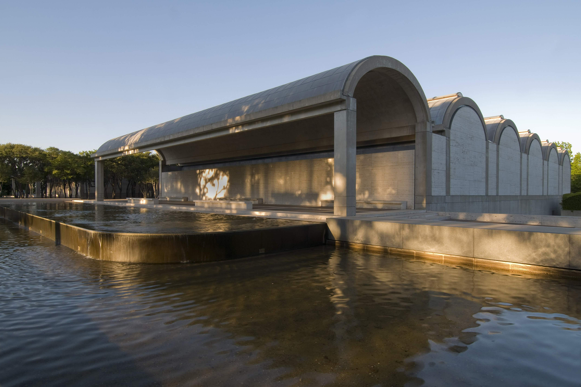 Ein früher Einfluss war sein Lehrer Paul Philippe Cret, der ihn an der University of Pennsylvania in Philadelphia unterrichtete und in dessen Büro er eine Zeit lang arbeitete. Cret, ein Architekt, der in der Tradition der Pariser École des Beaux-Arts stand, gab deren Ansätze an seine Schüler weiter und prägte auch Kahn, der in der Folge Themen wie Monumentalität und Symmetrie oder das Arbeiten mit Licht und Schatten in sein eigenes Schaffen aufnahm. Ein Beispiel dafür ist das 1972 fertig gestellte Kimbell Art Museum im texanischen Fort Worth, wo er ein symmetrisches, aus drei Teilen bestehendes Gebäude mit einem eingeschnittenen und mittig platzierten Eingangsbereich entwarf. In seiner Längsrichtung setzt sich das Museum aus additiv aneinandergereihten länglichen Betonvolumen zusammen, die jeweils von einem Tonnendach gekrönt werden und entweder als umbauter Raum oder als Vordach dienen. Dazwischen fügte Kahn Innenhöfe ein, die zusammen mit den Vordächern kunstvolle Übergänge zwischen Innen und Außen erzeugen. Im Ausstellungsbereich werden die einzelnen Tonnendächer von einem schlitzförmigen Oberlicht gekrönt. Das einströmende Tageslicht fällt über perforierte Aluminiumreflektoren unterhalb der Decke auf die Betonoberflächen der Tonnendächer und erzeugt ein weiches Leuchten.