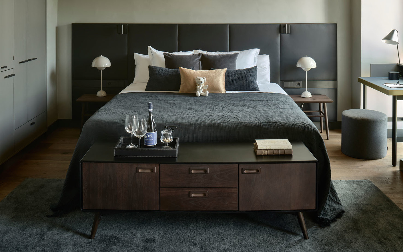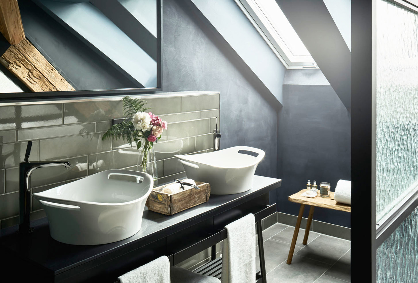 Für die Badausstattung wählten die Innenarchitekten Produkte von Axor aus. Passend zu dem historischen Charakter des Gebäudes sind die Waschtische der spanischen Designerin Patricia Urquiola eine Hommage an den traditionellen Waschzuber. In der Junior Suite gesellt sich die freistehende Badewanne aus der Axor-Urquiola Kollektion dazu. Ihr zur Seite steht mit sanftem Schwung und der Sonderoberfläche "Black Chrome" der bodenstehende Wannenmischer, Axor Citterio E. Die dunkle Veredelung haben ebenso die Einhebel-Waschtischmischer und Brausesets mit Thermostatmodul in den Bädern erhalten. Badaccessoires aus dem Programm Axor Universal Accessoires, ebenfalls von Antonio Citterio, runden das Ensemble stimmig ab. (am)