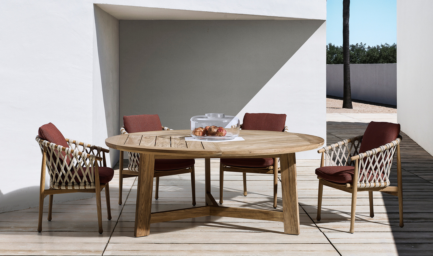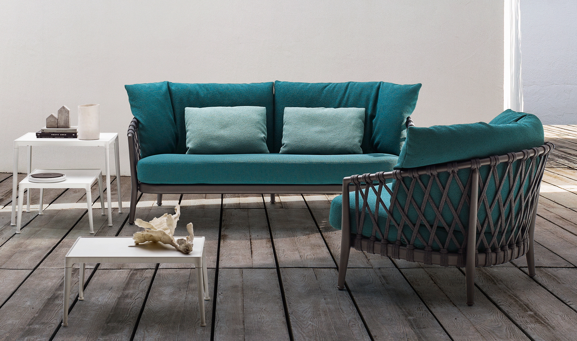 Antonio Citterio gehört zu den Designern, die die Kollektion von B&B Italia in den vergangenen Jahren stark geprägt haben. Nun geht er nach draußen in die frische Luft: Mit einer umfassenden Outdoor-Kollektion, die aus vier Linien besteht. „Erica“ ist die ausgefallenste davon – und überraschend verspielt. Die Konstruktion der Sessel und des Sofas aus Aluminium wird durch Seile verstärkt, die zu einem Netz verbunden sind. Drei Farbkombinationen stehen zur Auswahl: Taubengraue Seile zu weißem Gestell oder vollständig in Taubengrau und Weiß. Für die Polsterbezüge bietet B&B Italia wasserabweisende Stoffe in bis zu 12 Farben an, die aus garngefärbtem Polyester gewoben und mit Teflon ausgerüstet sind.