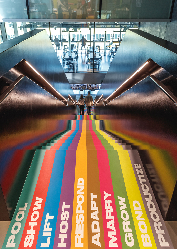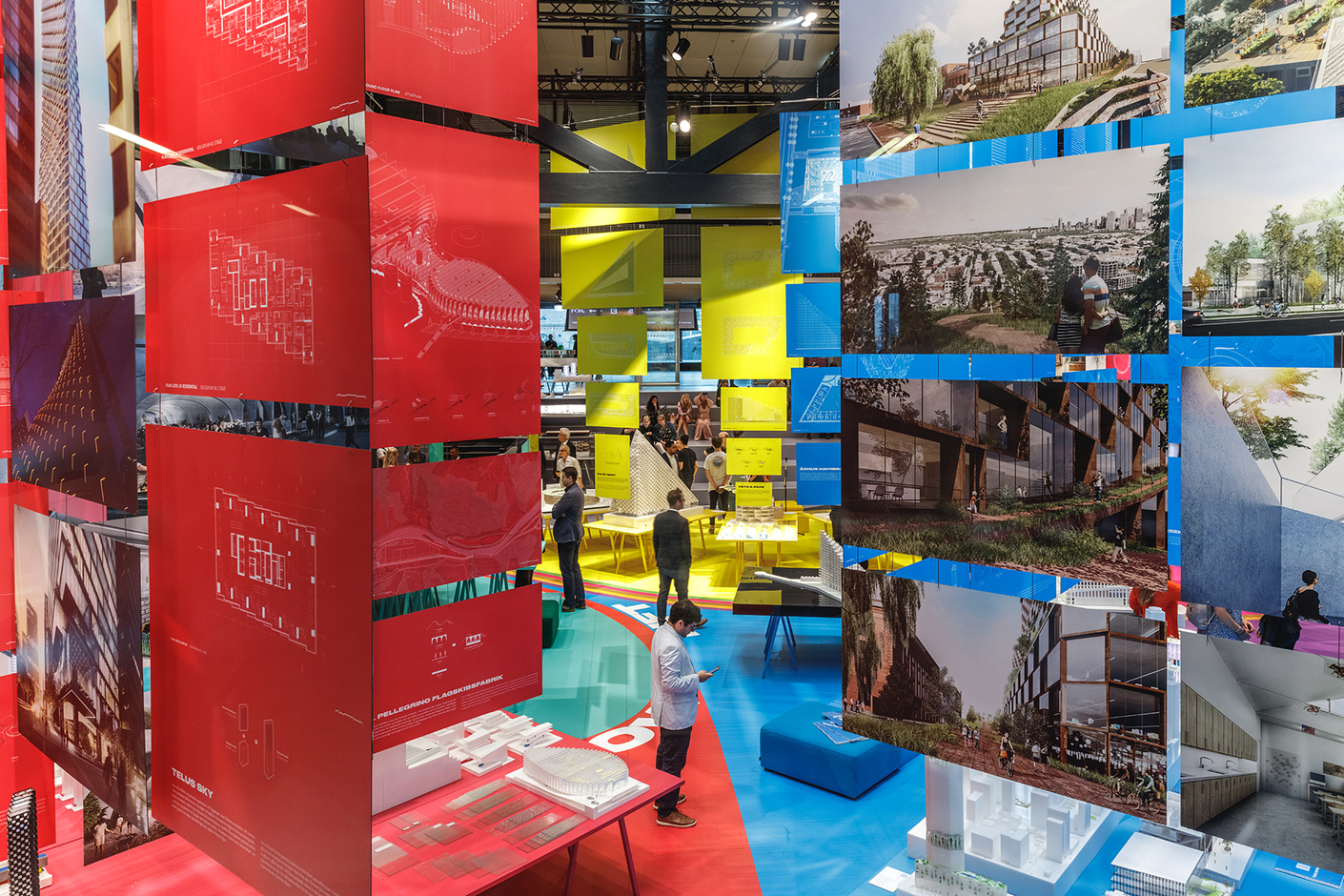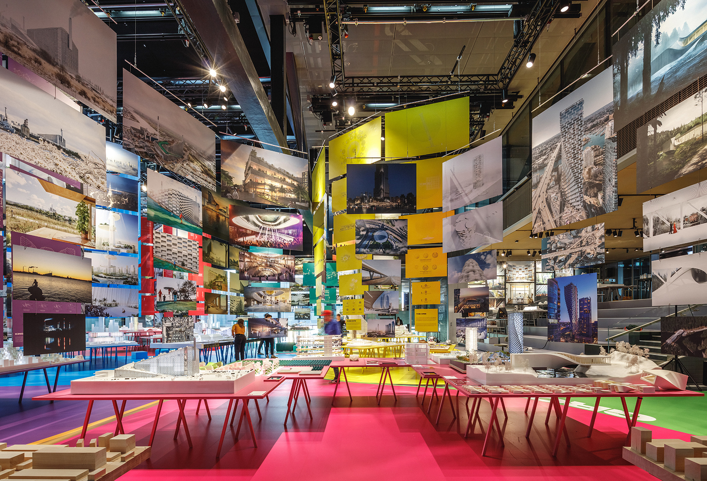 Im Vergleich mit der erst drei Jahre zurückliegenden letzten Werkschau "From Hot to Cold" ist die weitere Expansion des Büros unübersehbar. Und auch der Fokus der Präsentation hat sich verschoben. Die Vorgängerschau bemühte sich, das Prinzip der BIG-Architektur an jedem einzelnen vorgestellten Projekt unter Beweis zu stellen. Der Tenor: Wir finden für jeden Ort der Welt, von den Wüsten des Mittleren Ostens bis zum Polarkreis, eine Lösung jenseits des bisher Gedachten – die allen Erfordernissen optimal Rechnung trägt und darüber hinaus noch verblüffende Zusatznutzen schafft. "Formgiving" setzt viel stärker auf optische Überwältigung des Besuchers. Der hohe Ausstellungssaal mutet mit seinen unzähligen Modellen und mit von der Decke hängenden Bildertafeln – dreifach, vierfach, fünffach übereinander – kaleidoskopisch an. Die Aussage dieser Informationsflut lautet: BIG ist so erfolgreich, dass es fast das Wahrnehmungsvermögen übersteigt. Jedes einzelne Projekt vorzustellen? Nicht mehr möglich, es sind zu viele! Stattdessen werden alle Entwürfe unter zehn Oberthemen subsumiert. "Pool", "Show", "Lift", "Host", "Respond", "Adapt", "Merry", "Grow", "Bond" und "Productize" sind sie überschrieben. Jedes hat eine Farbe, jedes ein Areal im Saal, ablesbar am Fußboden.