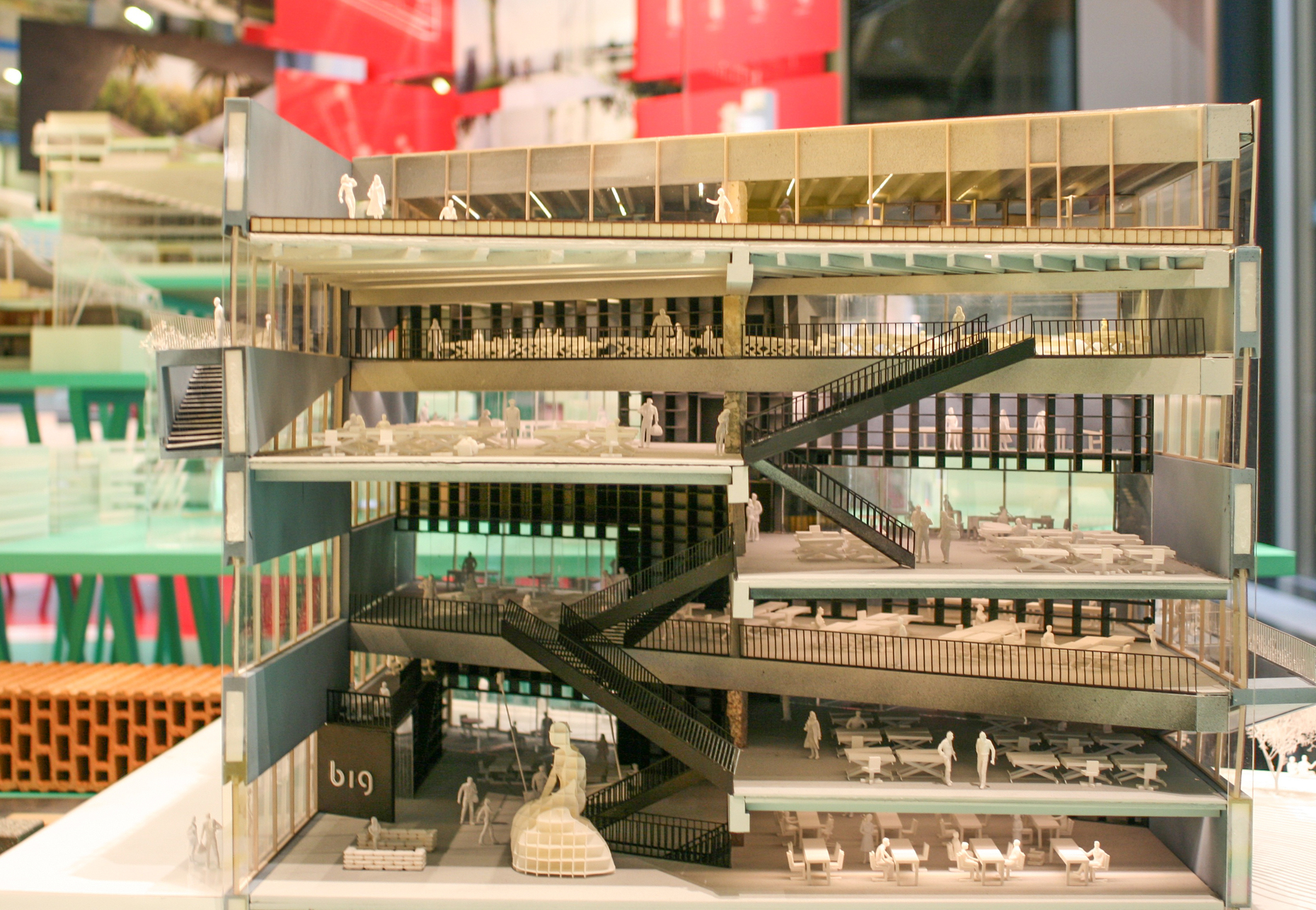 Der vielleicht spannendste Themenbereich der Ausstellung verbirgt sich hinter der Überschrift "Pool", ein Kapitel bei dem es nicht um das Baden, sondern um das "poolen" von Ideen und Schaffenskraft geht. Hier präsentiert BIG seine verschiedenen Officeprojekte für Google, hier kann aber auch ein erster Blick auf das in Planung befindliche neue BIG-Hauptquartier geworfen werden. Für sich selbst haben Ingels und seine Mitarbeiter einen Innenraum aus sich überlappenden Halbetagen entwickelt, der zahlreiche Blickbeziehungen zulassen soll. In Bezug auf das komplexe Raumerlebnis, das hier entstehen soll, verweisen die Architekten auf die berühmten Architekturerfindungen Piranesis als Vorbild – ein für BIG ungewohnter historischer Bezug und ein seltener Hinweis daraus, dass natürlich auch die Architektur von Bjarke Ingels nicht allein aus der Funktion entwickelt ist.
