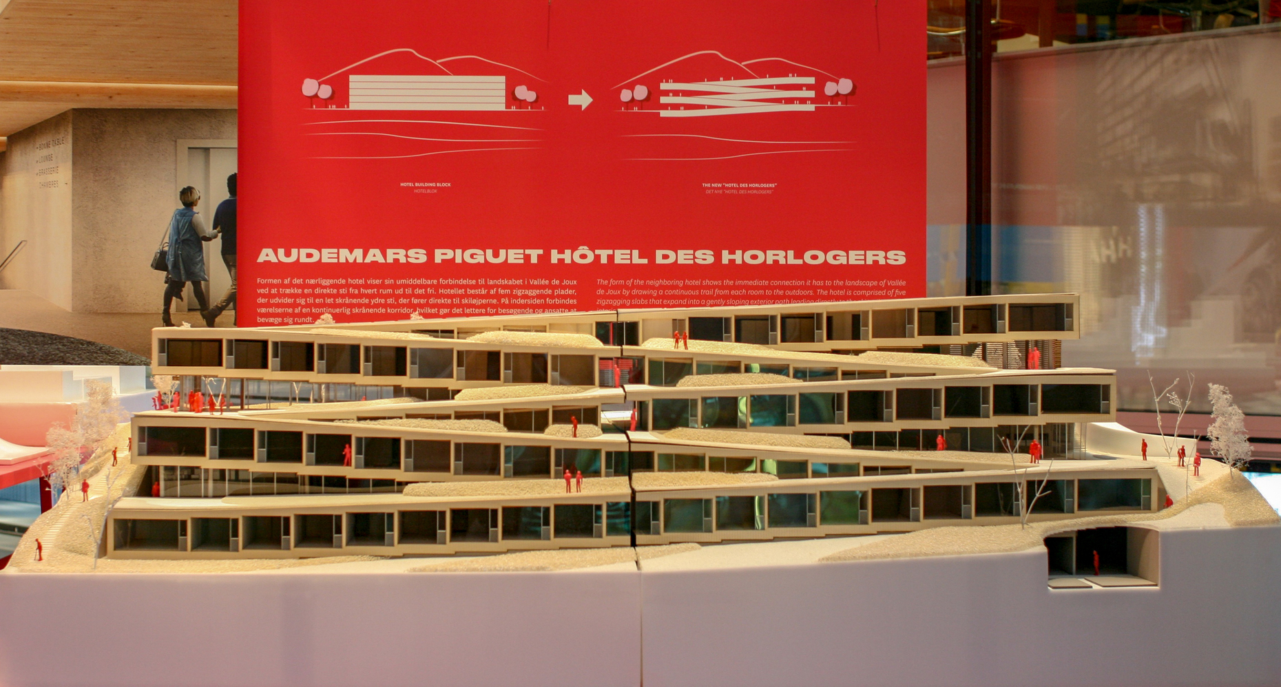 "Lift" beschäftigt sich mit Bauten, bei denen die Erschließung der Höhendimension eine besondere Rolle spielt – allen voran die verschiedenen Hochhausprojekte, an denen BIG zurzeit arbeitet. Etwa das 400 Meter hohe Two World Trade Center am Ground Zero, in das die Medienkonzerne 20th Century Fox und News Corporation einziehen sollten. Ähnlich dem gerade in der Fertigstellung befindlichen Omniturm in Frankfurt sollen bei diesem Entwurf durch Vor- und Rücksprünge Freiflächen in luftiger Höhe geschaffen werden. Allerdings ist die Zukunft des Projektes inzwischen ungewiss, weil die zwei Mediengiganten als Mieter abgesprungen sind. Gerade eröffnet wurde hingegen der Wohnkomplex AARhus, zwei pfeilförmige Apartmenthochhäuser, die direkt an das Strandbad anschließen, das ebenfalls nach einem Entwurf von BIG errichtet wurde. Beim "AARhus" hat das Büro seine Typologie des Hofhauses weiterentwickelt. Der Neubau ordnet sich dabei zwischen niedrigeren Anlagen wie etwa zuletzt dem 79 & Park in Stockholm und dem "Courtscraper" VIA 57 West in Manhattan ein. Eine andere Variante haben die Architekten für das Sluishuis am Stadtrand von Amsterdam entwickelt. Bei dem ebenfalls direkt am Wasser gelegenen Bau stellen sie der für BIG charakteristischen an einer Blockecke heruntergezogenen Dachlinie eine "hochgezogene" Ecke gegenüber, sodass dort ein gewaltiges Tor zum Innenhof entsteht. Durch dieses Tor können Boote hindurchfahren und in der kleinen Marina im Hof vor Anker gehen. In der Ausstellung ordnen die Architekten dieses Projekt dem Themenfeld "Host" zu, ebenso wie das soeben fertiggestellte MÉCA in Bordeaux, ein Kulturzentrum direkt an der Garonne. Dessen auffälligstes Merkmal ist ein gewaltiger Durchgang in seiner Mitte, der zugleich als geschützte Bühne und Ausstellungsfläche verwendet werden kann.