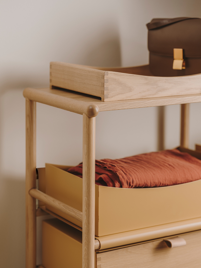 Für den Wechsel in eine andere Umgebung können alle freistehenden Elemente von "MYA" komplett auseinandergebaut werden. Nachhaltigkeit, die nicht beim Material endet – Jeannette Altherr hat das System als lebenslanger Begleiter gedacht, dass durch die Jahre mitwächst und sich in jeden neuen Raum integrieren lässt. Gleichzeitig schafft die Kollektion mit sanften Linien und perfekten Proportionen eine wohnliche Atmosphäre, die angenehme Emotionen weckt. Die Sicherheit, Beständigkeit, Wärme und Natürlichkeit ausstrahlt. "Grounded", nennt Jeannette Altherr den ursprünglich wirkenden Charakter von "MYA", der mehr durch einen handwerklichen als einen industriellen Ansatz geprägt ist. Inspiriert von der schlichten Ästhetik der Holzmöbel, die von den Handwerksmeistern der christlichen Shaker-Bewegung gefertigt wurden, braucht es keine optischen Reize. Die Metallflächen greifen in der Lackierung den Farbton des Holzes auf. Alle Ebenen wirken ruhig und klar. Selbst die Verschraubungen werden verdeckt angebracht. Matt lackiert erhalten die Oberflächen aus Eichenholz eine natürliche Eleganz, sattes Schwarz bietet als Option mehr Tiefe. Alles passt zu allem, bis in das letzte Detail. Ein Prinzip, das in jeder Kombination ein stimmiges Gesamtbild formt. "Mit der individuellen Nutzung erwacht die Kollektion zum Leben", so Jeannette Altherr.