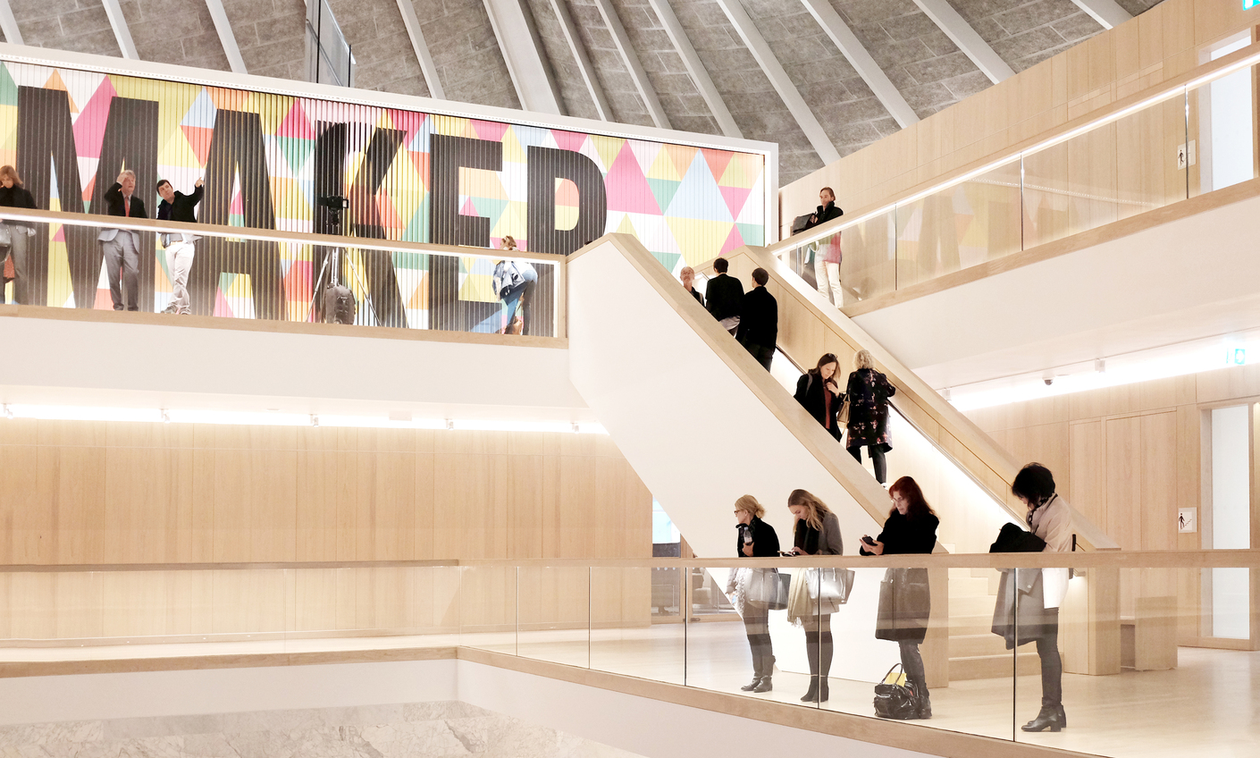 Von all dem ist dennoch kaum etwas zu spüren, wenn man die von Pawson bewusst ruhig gestaltete Architektur der eindrucksvollen Eingangshalle mit ihrem Atrium betritt. Pawson selbst hat den Raum mit einem ‘Tagebau’ verglichen, eine merkwürdige Metapher für einen Ort mit derartig makellosen Oberflächen und einer solchen Eleganz und auch Leere. Der minimalistische Ansatz von Pawson ist nach zwanzig erfolgreichen Jahren fast so etwas wie eine Marke und der bevorzugte und allgegenwärtige Stil, wenn es darum geht, hochwertige Büros, Läden oder Apartments auszustatten. Insofern ist er nicht wirklich überraschend. Der Raum hat sicherlich einen Wow-Faktor, aber dieser ist eher leise. Wie bei so vielen anderen Museen und Kunsträumen heutzutage scheint hier weniger das Anschauen von Ausstellungen als von Personen im Vordergrund zu stehen. Es ist eine Architektur, die nicht in erster Linie von A nach B führt, sondern eine in der es sich umherwandeln lässt, die eine spektakuläre Kulisse für Selfies schafft, in der es um das Sehen und Gesehenwerden geht – wie beispielsweise auch im Falle des glorifizierten Treppenaufgangs des neuen Erweiterungsbaus der Tate Modern.
