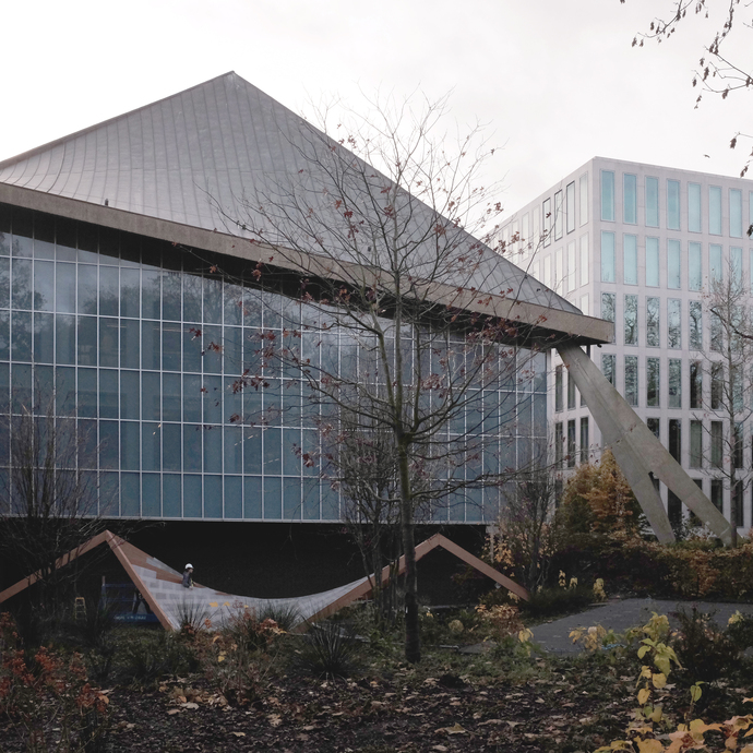 Diese Decke ist die Unterseite des Kupferdaches des ehemaligen Gebäudes des Commonwealth Institute von 1962, welches mehr als ein Jahrzehnt leer gestanden hat und nun über fünf Jahre durch das Rotterdamer Büro OMA umgebaut wurde. Das Dach mit seiner speziellen Formgebung, es handelt sich um ein hyperbolisches Paraboloid, welches die Anmutung eines Zeltes im Park haben sollte, ist im Prinzip das einzige erhaltene Element des ursprünglichen vom Architekten Robert Matthews entworfenen Baus. Reinier de Graaf von OMA beschrieb das Projekt mit den Worten: „Die Erhaltung des Gebäudes mündete zunächst in umfassende Sanierungsmaßnahmen und schließlich in eine Replik”, da das ganze Gebäude bis auf das Dach aus bautechnischen und ökologischen Gründen rekonstruiert werden musste. Die verglasten Fassaden aus den 1960er Jahren wurden durch energieeffiziente Versionen mit Fritteglas ersetzt, die dem Original ‘nachempfunden’ sein sollten, was den etwas zombiemäßigen Anblick der Außenansicht des Gebäudes erklärt.
