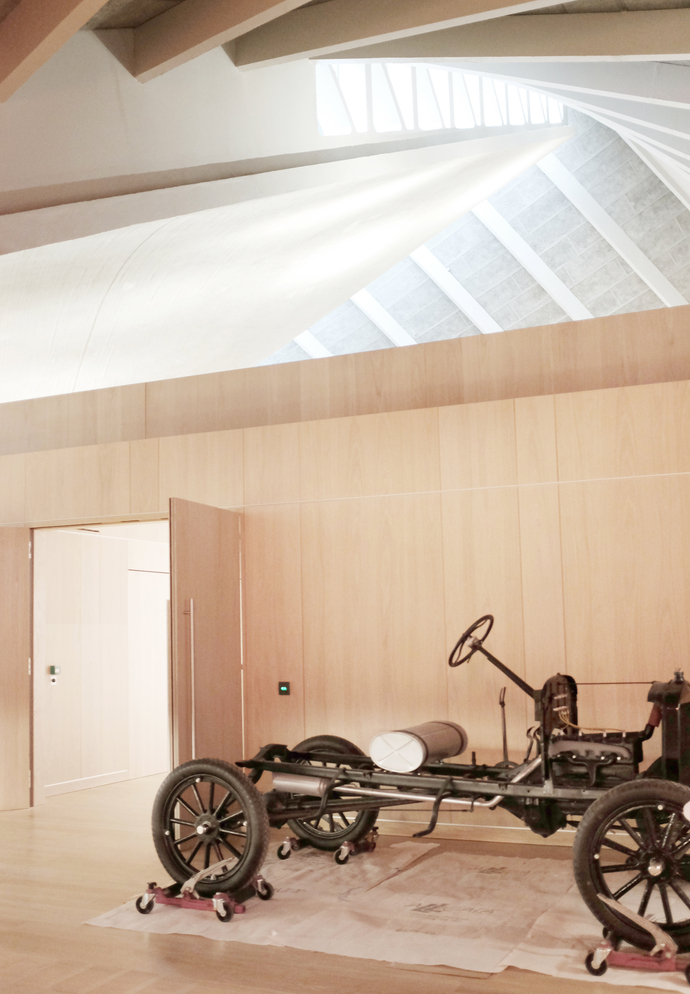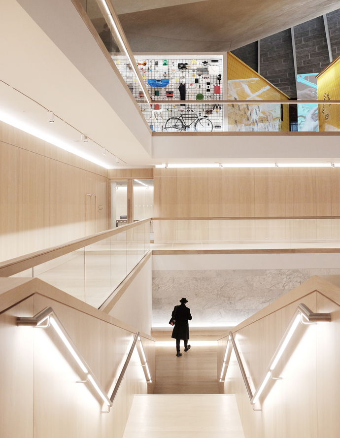 Die Innenräume des Museums hat der radikal-minimalistische Architekt John Pawson gestaltet. Im spektakulären Eingangsbereich, der von weiß verputzten Flächen und hellem Holz und nicht etwa von Exponaten dominiert wird, führt eine Freitreppe auf die umlaufenden Emporen. Die Silhouetten der Besucher bilden einen lebendigen Kontrast zur markanten Rechtwinkeligkeit der schneeweißen Treppenaufgänge und vor der geschwungenen grauen Betondecke darüber.