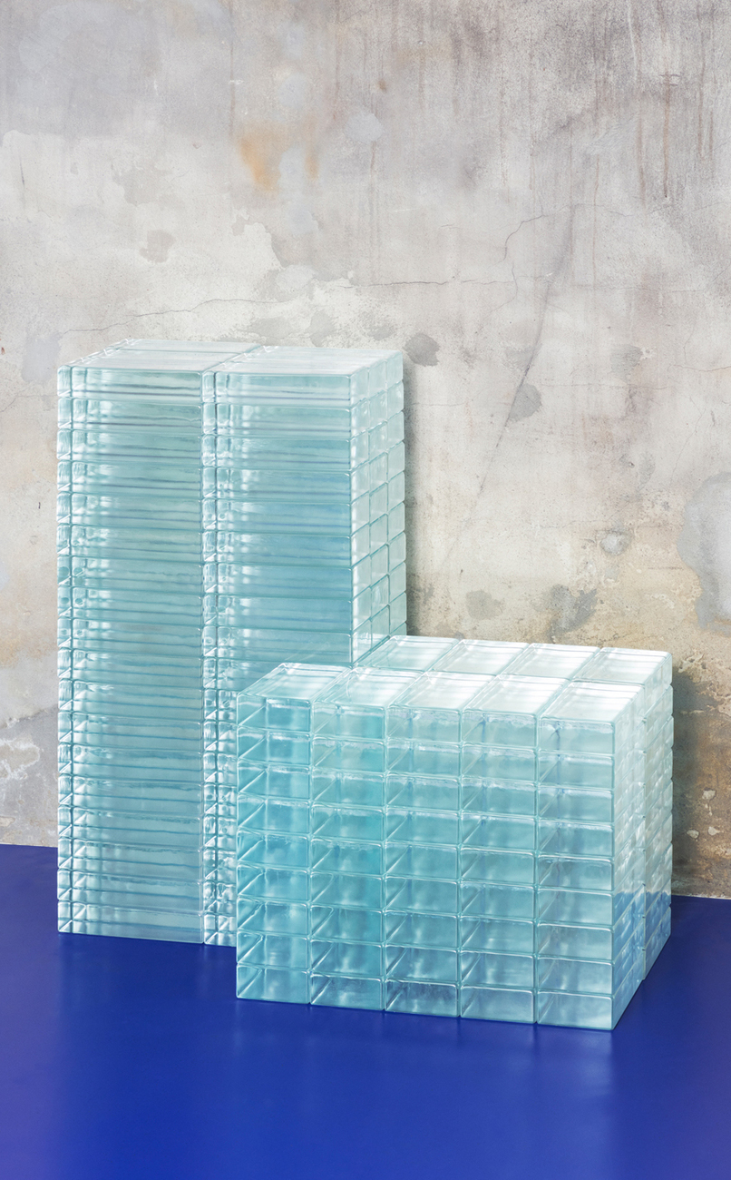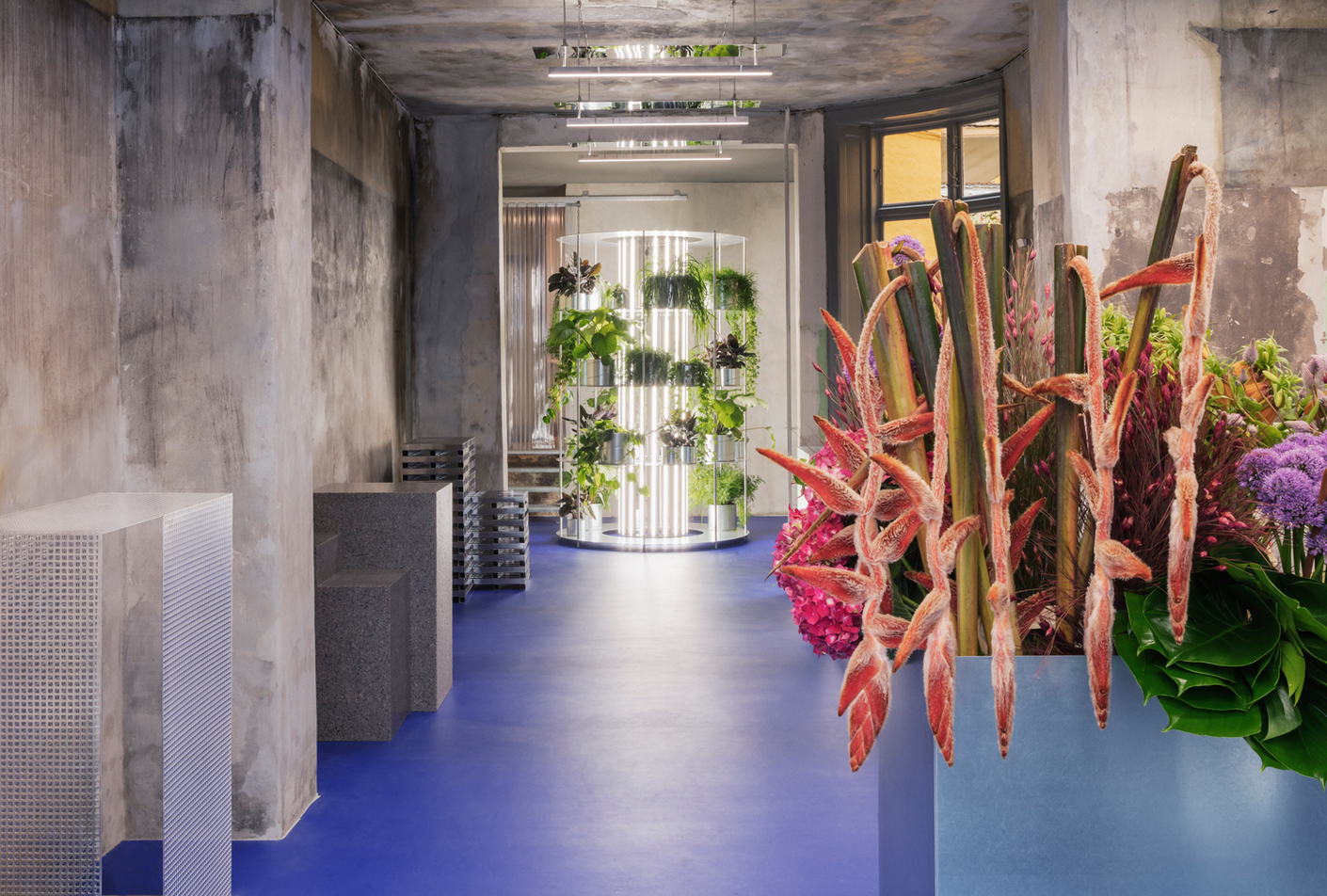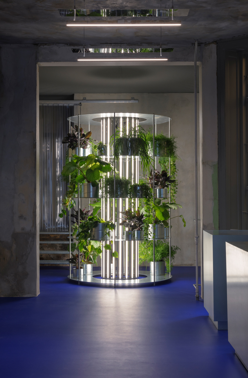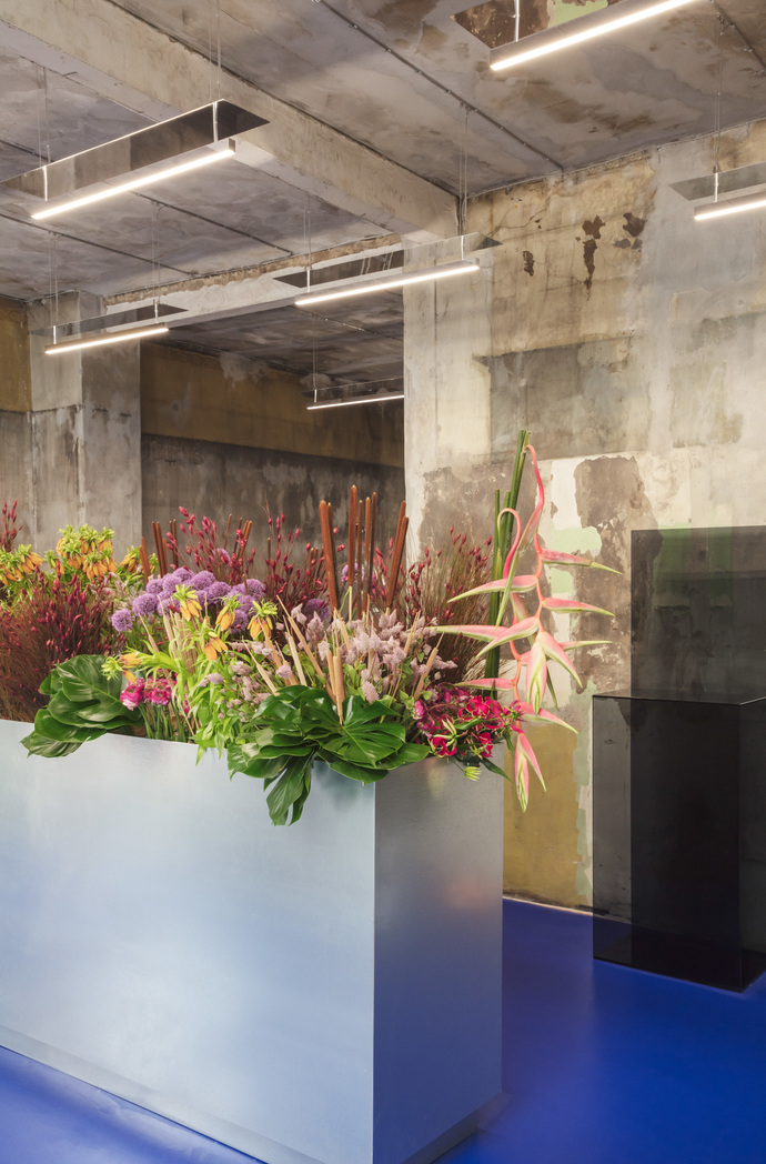 Der klassische Blumenladen: Vollgestopft bis zur Decke mit Gestecken, Schnittblumen, Zweigen und Dekoration. Die meist schmucklose Architektur der Verkaufsräume hat hier nur eine Aufgabe – möglichst hinter dem üppigen Grün zu verschwinden. David Thulstrup hat für Tableau in Kopenhagen den gegensätzlichen Ansatz gewählt. Die Architektur erfährt eine Befreiung aus ihrem Schattendasein und rückt in den Fokus: Sichtbeton an den Wänden und längliche LED-Leuchten unter der Decke sorgen für einen klaren Rahmen, den der Vinyl-Boden in strahlendem Blau effektvoll kontrastiert. Statt Pflanztreppen mit zahlreichen Gestecken zu bestücken, werden wie in einer Kunstschau ausgewählte Blumen in geometrischen Vasen auf Podesten präsentiert. Diese Podeste bestehen jeweils aus unterschiedlichen Materialien wie Terrazzo, Glas, Granit, poliertem und perforiertem Metall. Die einzigartigen Sockel wurden in Zusammenarbeit mit Künstlern wie Poul Isbak geschaffen und stehen wie die ausgewählten Blumen zum Verkauf. Auch an das Wohlbefinden der dekorativen Gewächse hat Thulstrup gedacht: Für die Topfpflanzen hat er ein Rondell mit integrierter Lichtskulptur entwickelt, die je nach Tageszeit die ideale Beleuchtung für optimales Wachstum erzeugt.