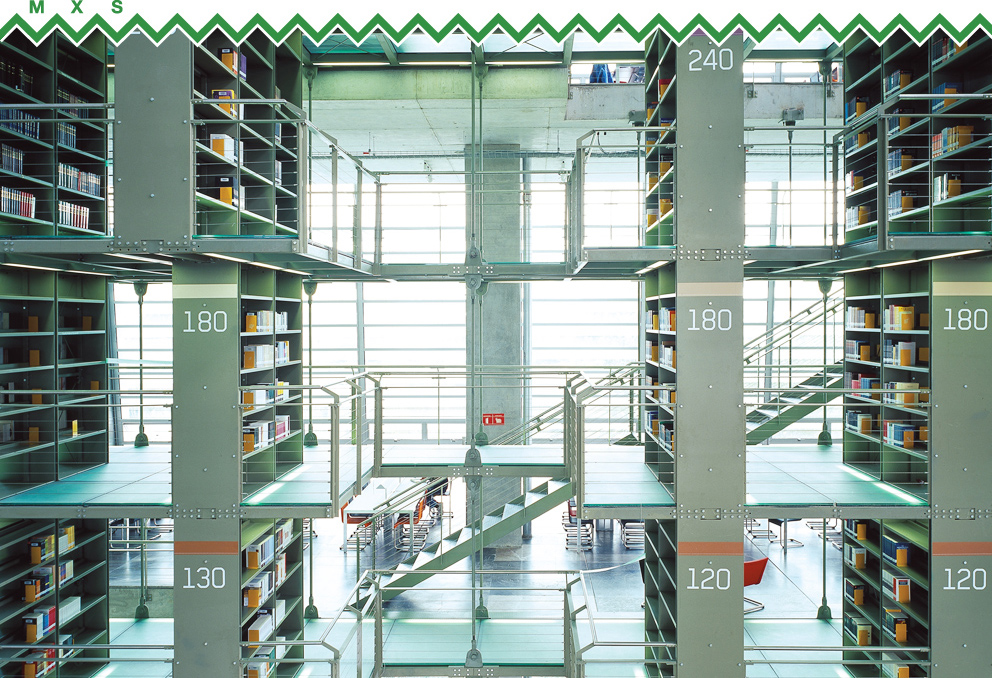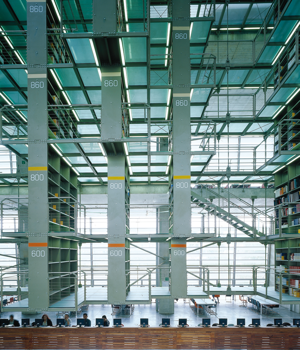 Das 250 Meter lange und 30 Meter hohe, geschwungene Gebäude wird durch die schrägen Außenwände, durch die Tageslicht einfällt, und durch die Massen an hängenden Bücherregalen geprägt. Alle Elemente sind der gleichen symmetrischen Strenge unterworfen: Von den Leseräumen an der Gebäudeseite eröffnet sich der Blick auf den gesamten Komplex. Die Identität der einzelnen Räume ergibt sich nicht durch deren individuellen Merkmale, sondern sie entsteht durch den Bezug zur zentralen Halle, die das Rückgrat der Bibliothek bildet.