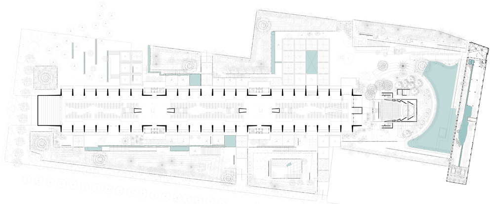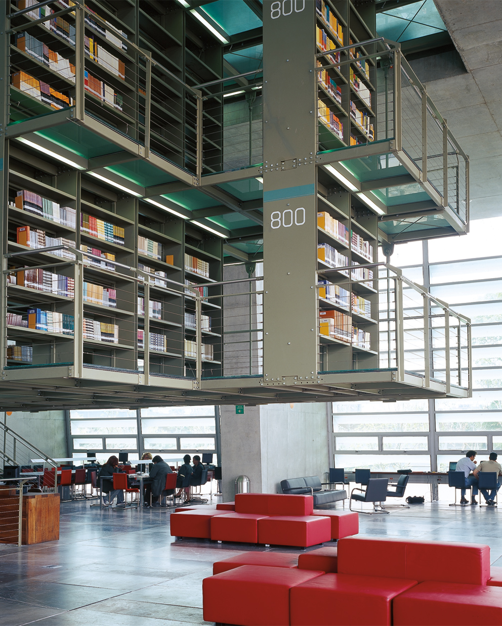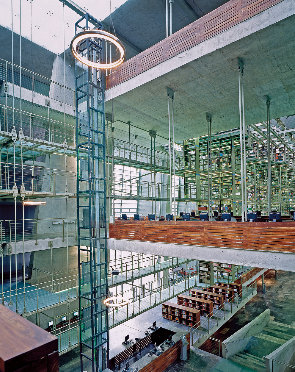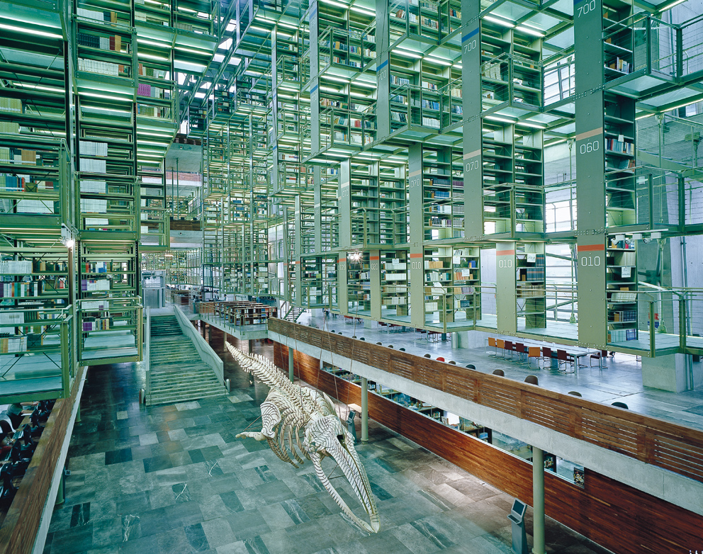 Die Bücherregale sind eine unabhängige Konstruktion aus Glas und Stahl, die von den Dachträgern abgehängt ist. Zusätzlich zu diesem Haupthaus gibt es drei Nebengebäude, die in den Botanischen Garten integriert sind: Eines beherbergt die Büroräume, ein zweites den Buchladen und das dritte, nördlich gelegene, das Auditorium. Das Walskelett – ein Beitrag des Künstlers Gabriel Orozco – hängt in der Mitte der riesigen Halle und unterstreicht die Monumentalität dieses beeindruckenden Raumes.