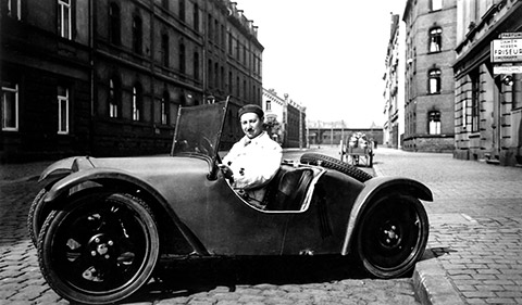 Vorkämpfer für preiswerte Massenmobilität: Josef Ganz in seinem zweiten, 1931 für Adler konstruierten Prototyp, dem offenen Zweitakter „Maikäfer“. Foto © Josef Ganz Archiv/Paul Schilperoord, Den Haag
