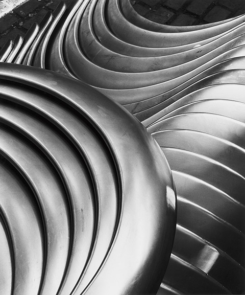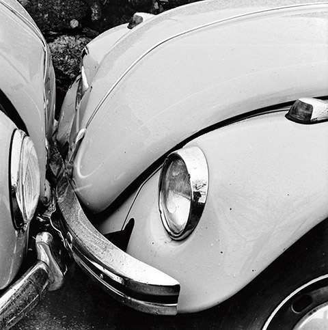 Reportagebild mit Käfer-Kotflüglen im VW Presswerk Halle 2 aus der Serie „Volkswagenwerk“ von Peter Keetman aus dem Jahr 1953. Foto © Peter Keetman bei F.C. Gundlach
